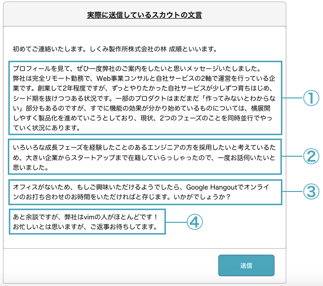 しくみ製作所さまが実際に候補者に送信しているスカウトの一例です。