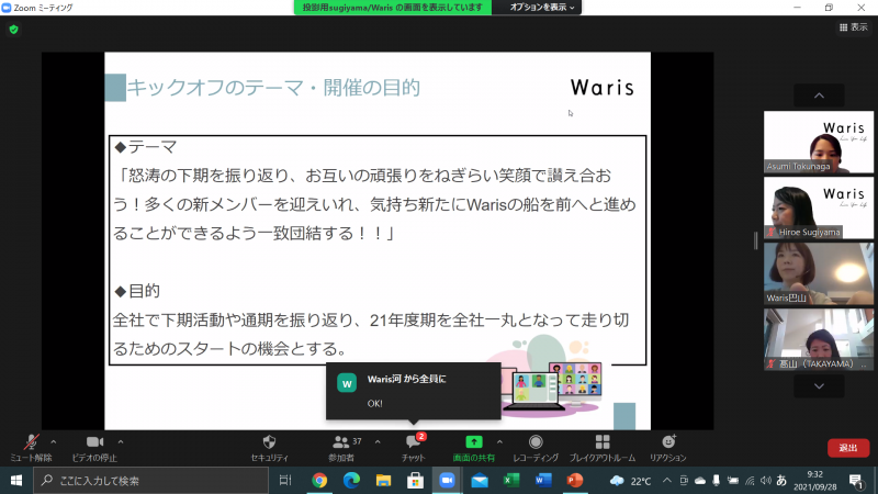 Warisでは、創業以来完全フルリモートワークの体制を整備しながら、対面・出社とのハイブリッド形式での事業運営をしてきましたが、例年キックオフMTGは、関わる全メンバーが年に1回、一同に会す対面形式で開催しておりました。しかし、新型コロナウイルスの影響で、前回に引き続き今回もリモートでの開催…(泣)