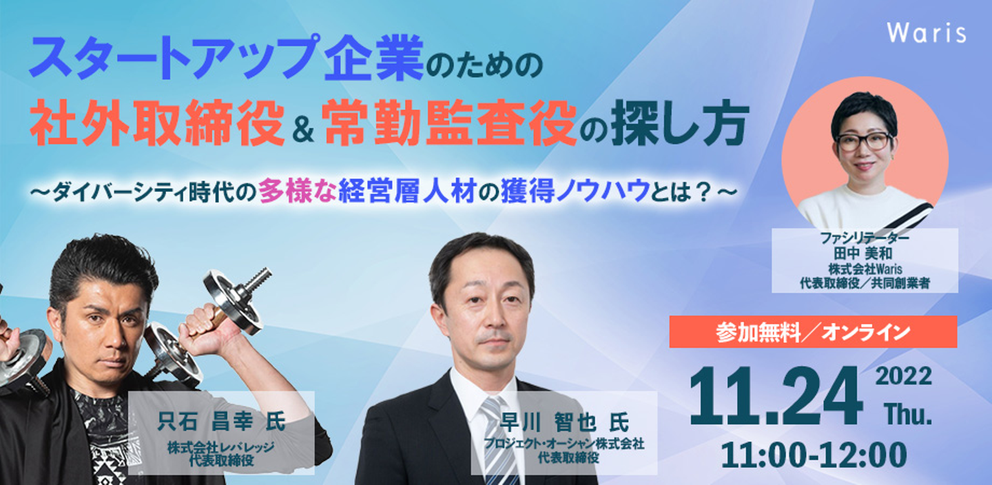 2022年11月24日に開催したWaris主催ウェビナー「スタートアップ企業のための社外取締役&常勤監査役の探し方」の開催レポートをお届けします。