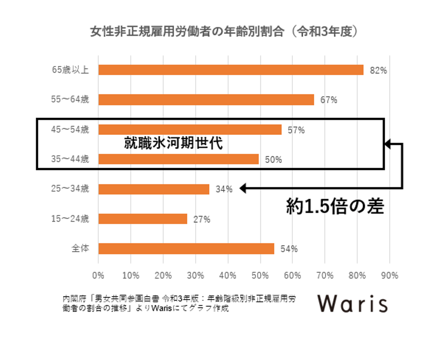 実際に「男女共同参画白書 令和3年版」の年齢階級別非正規雇用労働者の割合の推移でみても、25~34歳の女性の非正規雇用者率が34%であるのに対して、35歳~44歳の女性は50%、45~54歳の女性は57%と、世代によって約1.5倍もの差がある状況です。