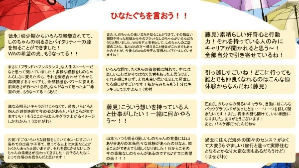 また、メンバーのLive My Lifeシェアが終わった後に、発表メンバーのひなたぐちを他のWarisメンバーが書くというワークもおこなっています。陽口(ひなたぐち)とは、陰口の反対で自分がいかに周りに見てもらっているか、当人がいないところで承認・賞賛を言うことです。
