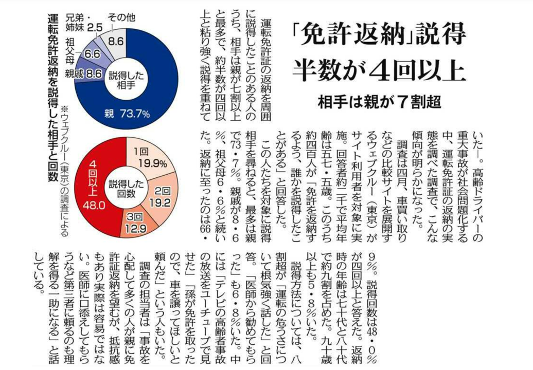6月にウェブクルーが調査を実施し、リリースした「運転免許証の返納に関する調査」ですが、東京新聞をはじめとして北海道新聞・中日新聞・山陽新聞などなど・・様々な新聞に掲載して取り上げていただきました!