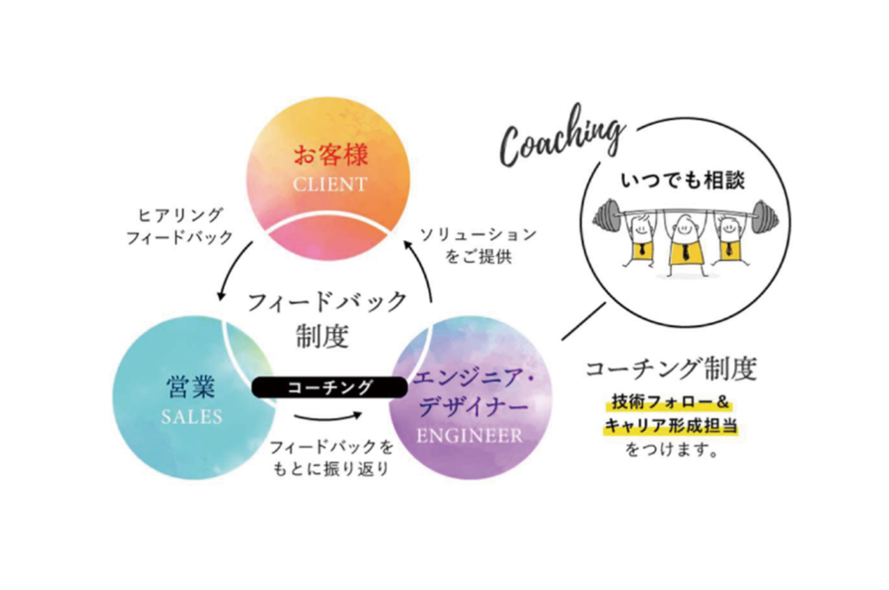 また、別途「 コーチング制度 」を導入し、業務進行における技術的な「不安」や「キャリアアップ」における悩みなどを気軽に相談できる環境を整えています。