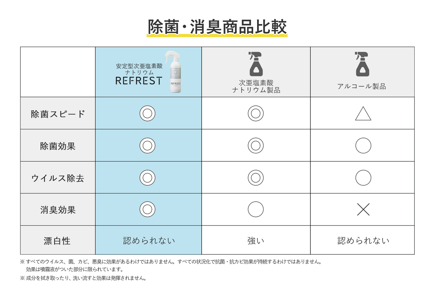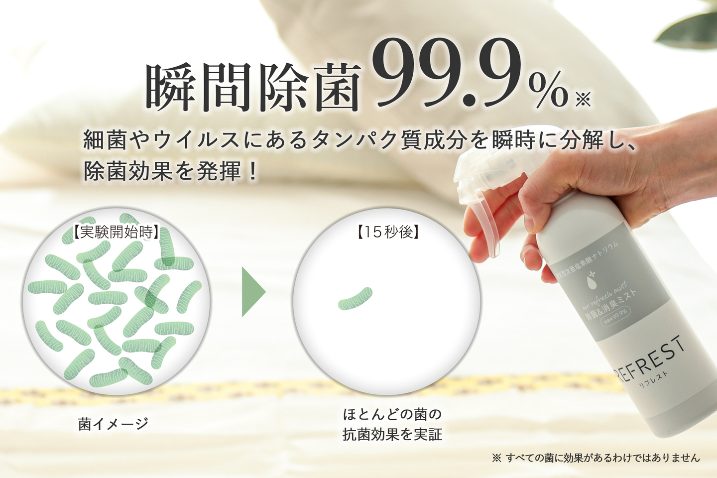 第三者検査機関による試験実施済。スプレー直後はごくわずかな塩素の臭いが除菌力を実感できます。