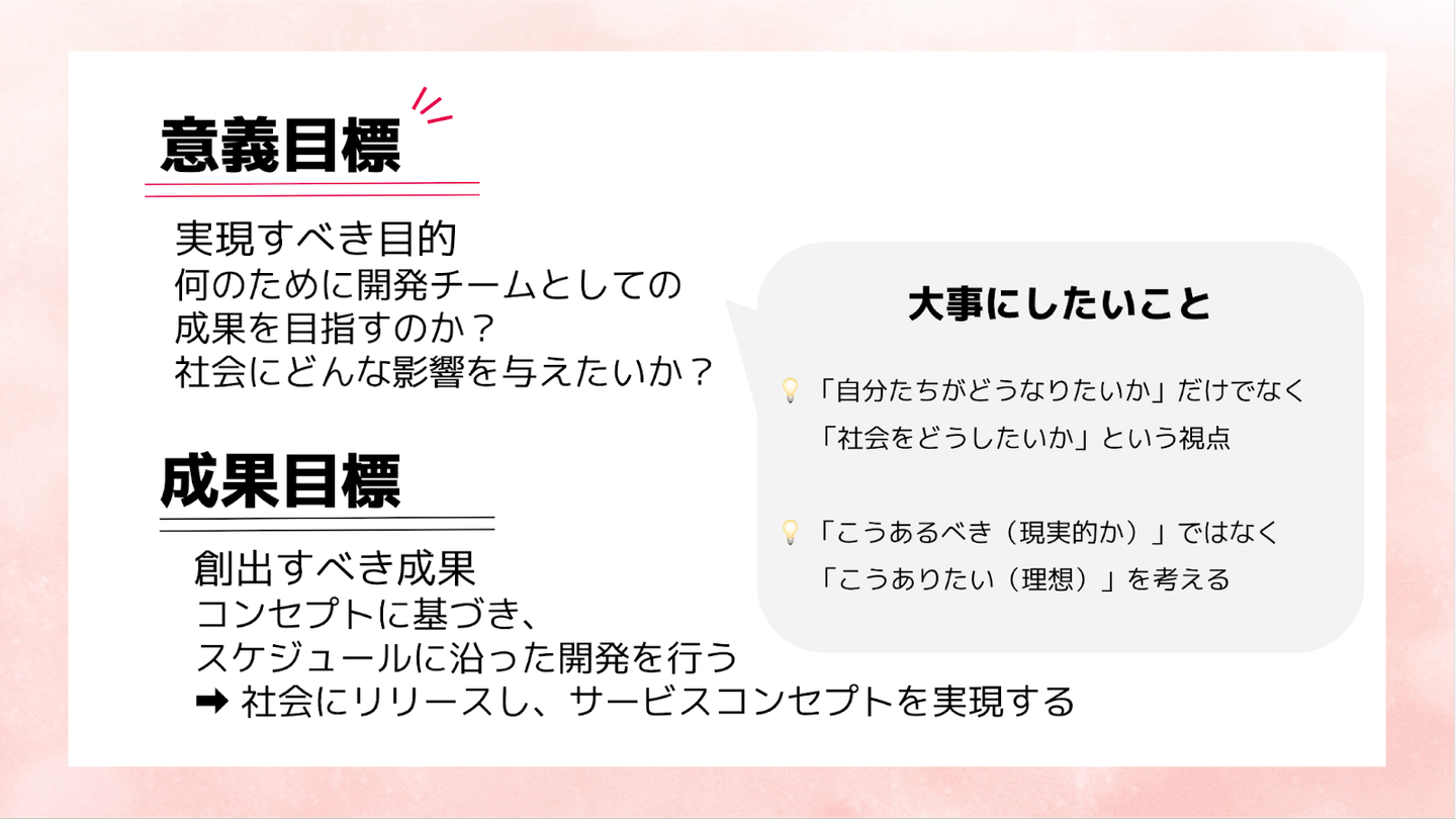 職種も年次も多様なプロジェクトメンバーの目線を揃えるため、何を達成するのか?という「成果目標」とは別に、何のために達成するのか?という「意義目標」を、みんなで議論して決めたいと企画しました。