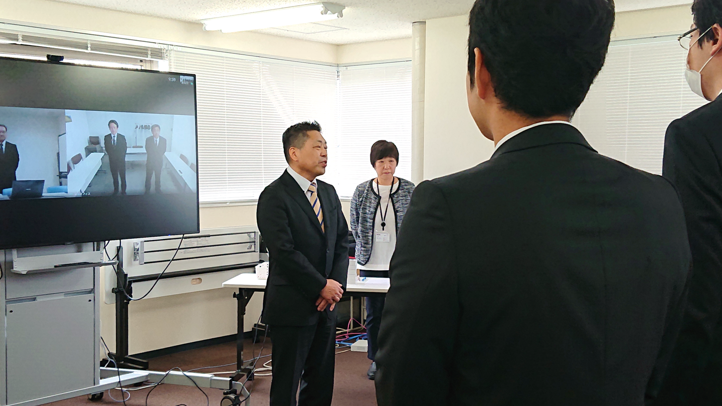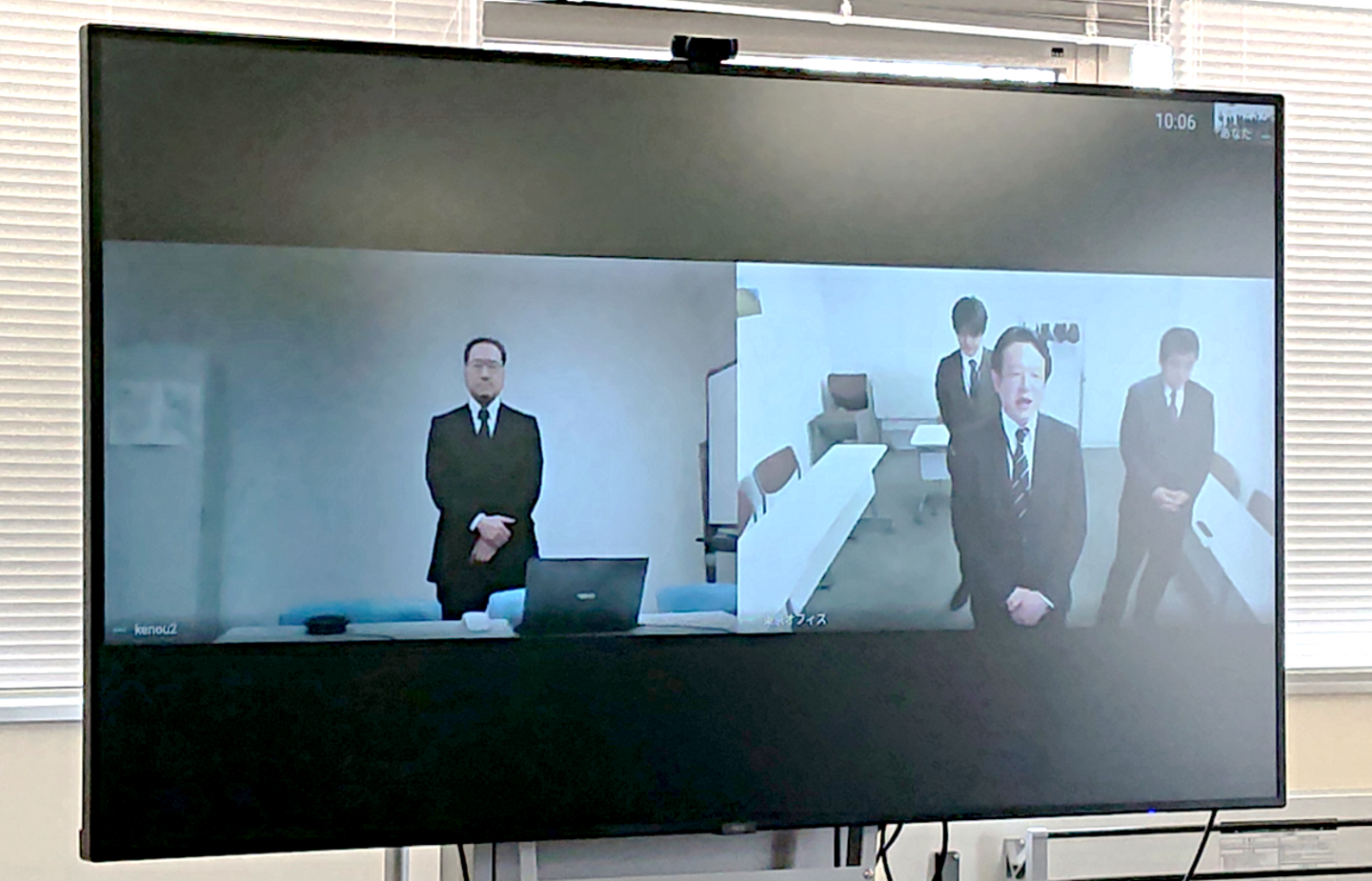 東京オフィスや県央オフィスとはwebミーティングでつなぎ、役員から歓迎の挨拶がありました。