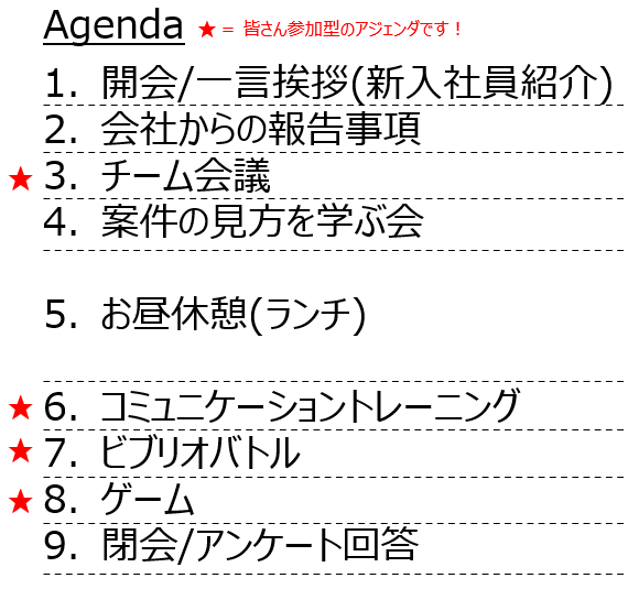 「会社からの報告事項」や「チーム会議」は毎回固定のアジェンダですが、その他のアジェンダについては毎回社員からの声やアンケート結果をもとに決定しています!(なので毎回違ったアジェンダで新鮮で楽しい!)