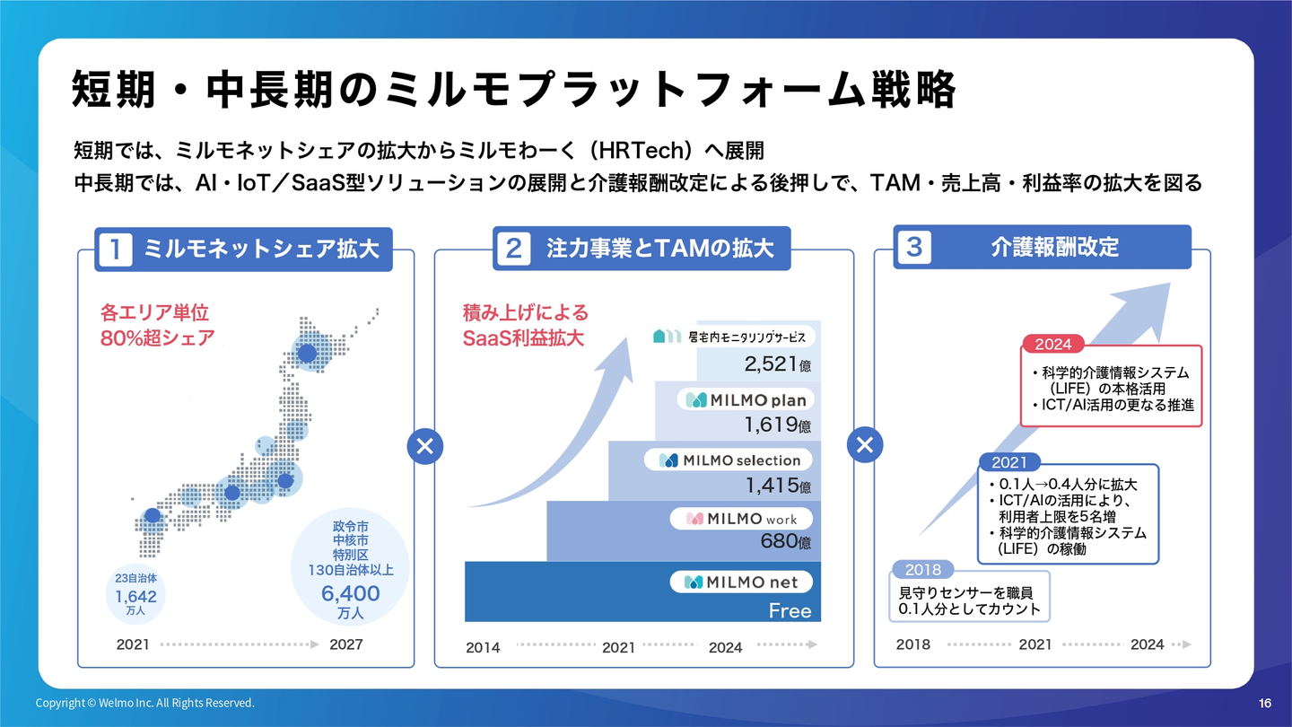 まずはデータの基盤となるミルモネットのシェアをさらに拡大。そして、収集したデータをもとにAI・IoT/SaaS型ソリューションを展開し、介護報酬改定も味方につけながら、TAM・売上高・利益率を拡大していこうというのが、今回のウェルモの経営戦略です。