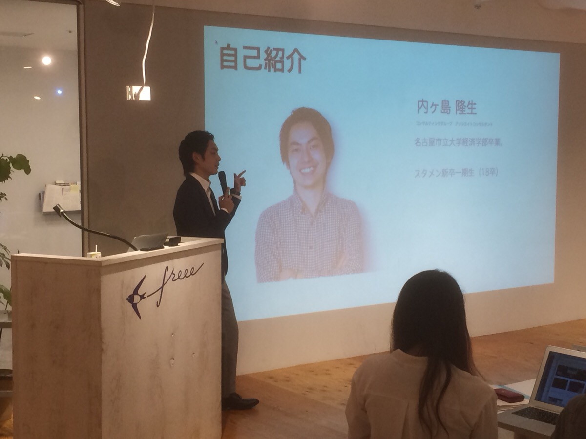THE営業の内ヶ島さん。持ち前の明るさと人の懐にうまく入り込むのがうまい方で、スタメンさんは名古屋にある会社ですが、五反田にも拠点があるということでご参加いただきました。現在新卒採用は名古屋でも東京でもやっているようですが、学生に刺さる内容が全く違うとのこと。営業するときと同じく、地域によって話す内容は変えるべきと教えてくれました。