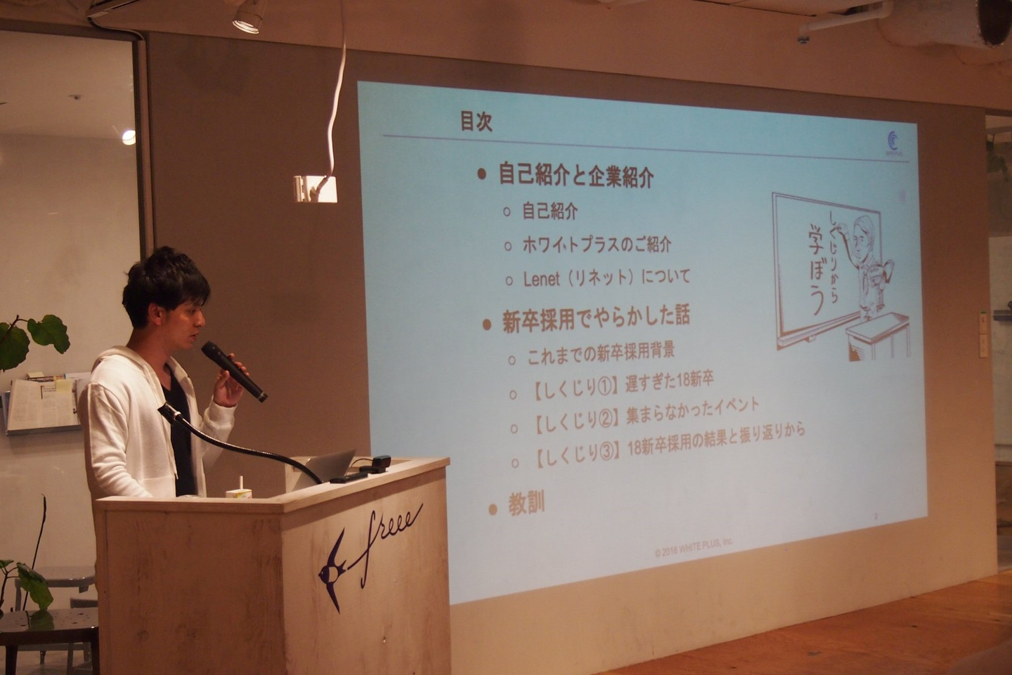 私からは、そもそも新卒採用の動き出しが遅かったことによりデメリットや、他社様と合同でイベントやったけど全く人が集まらなかった話や、18新卒採用の結果と振り返りについてお話ししました。