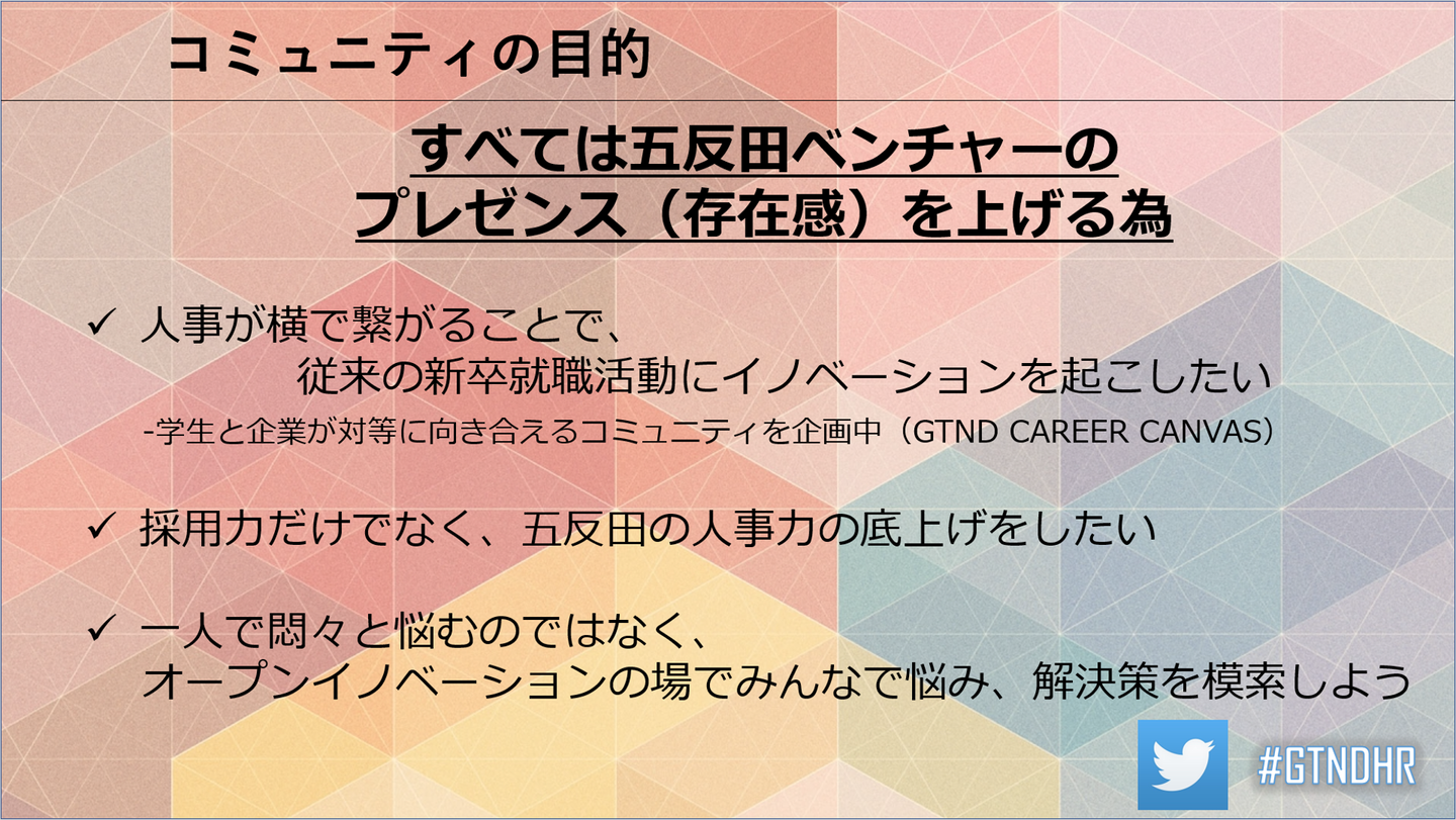 そんな認知が取れれば、採用力はもちろんのこと、人事力や会社の競争力は上がるし、就職活動の学生さんや転職活動をしている人にとっても、選択肢や気づきを与えられるじゃないかと思って、GTND HR Communityを作りました。