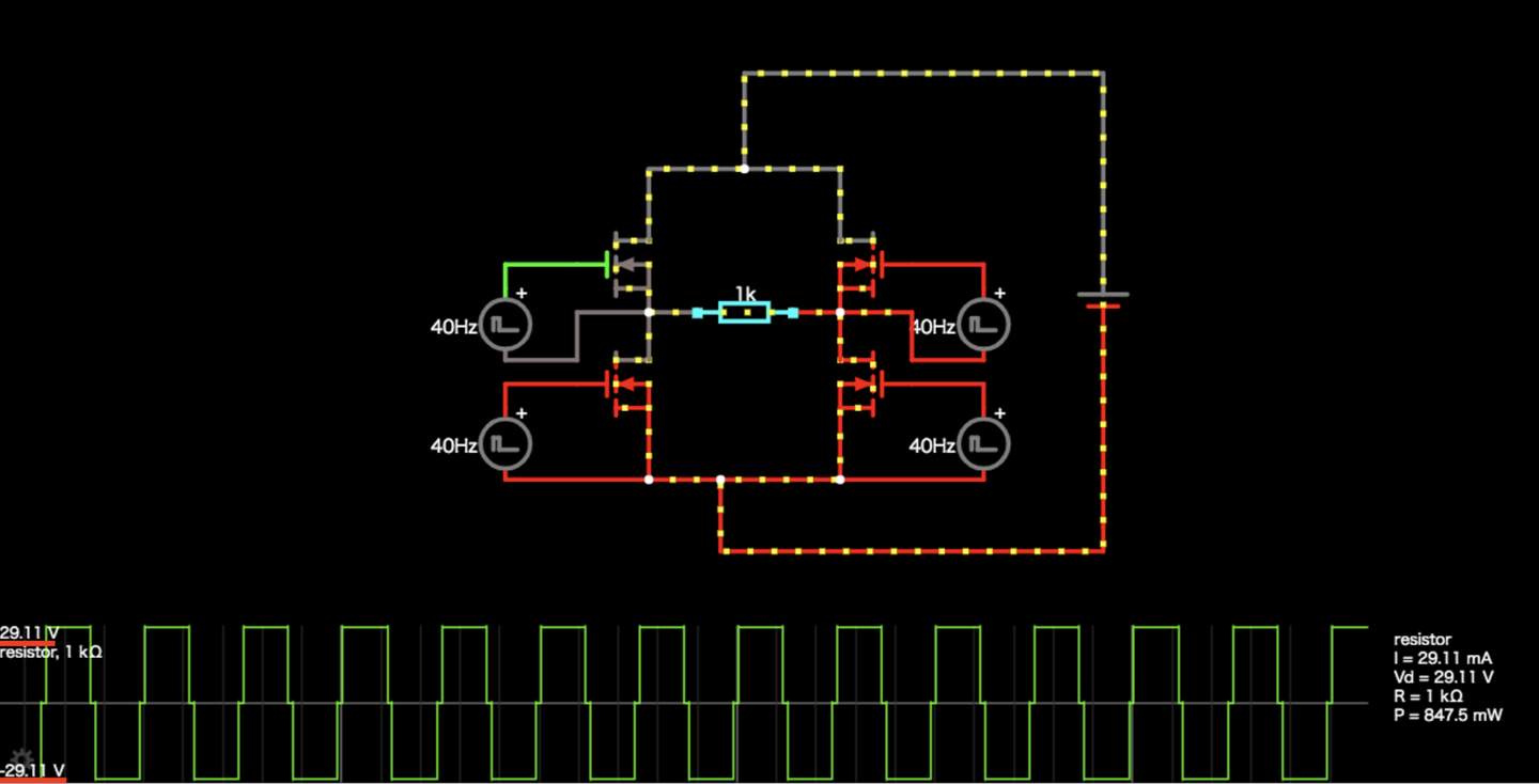 ⬆️の場合、同じ電源電圧なのに負荷にかかる電圧は+ー29.11Vで約60Vほど掛かっています。ハーフブリッジがコンデンサによって中間電位を作っているのに対してこちらは使ってません。その分電圧が2倍になります。出力で言うと4倍になります。