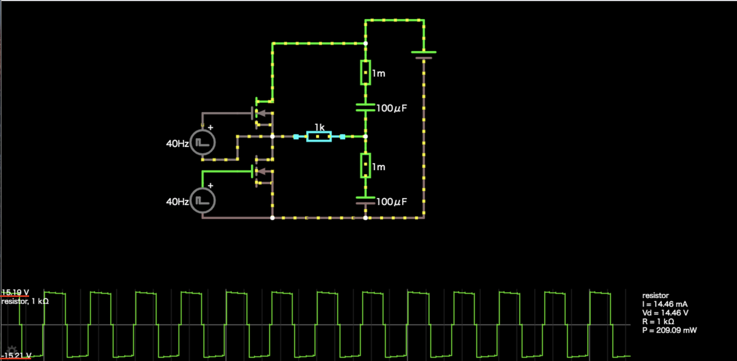 ⬆️の波形は負荷にかかる電圧、電流波形です、電源電圧30Vの時、+ー15.19Vなのでちょうど30.38Vで電源電圧ぶんがかかっています。(1mΩはないとシュミュレーションでエラーになるので、、、この辺りは微妙です。教えてくださいmm)