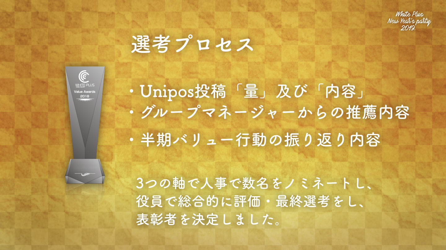 目標設定内の半期バリュー行動の振り返り内容やUniposの投稿された数、グループマネージャーやプロダクトオーナーからの推薦をもとに、経営陣での検討によって決められました。