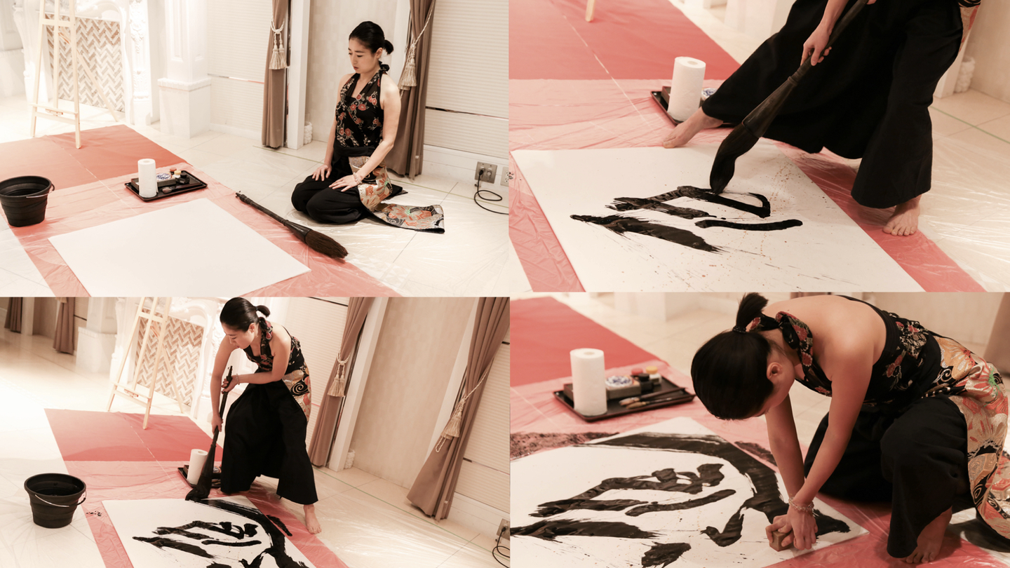 お打ち合わせのときとは違って衣装に着替え、凛とした佇まいで登場された啓華さんの姿を見て、会場も息を飲みました。準備が整うと、音楽に合わせて書道パフォーマンスが始まります。