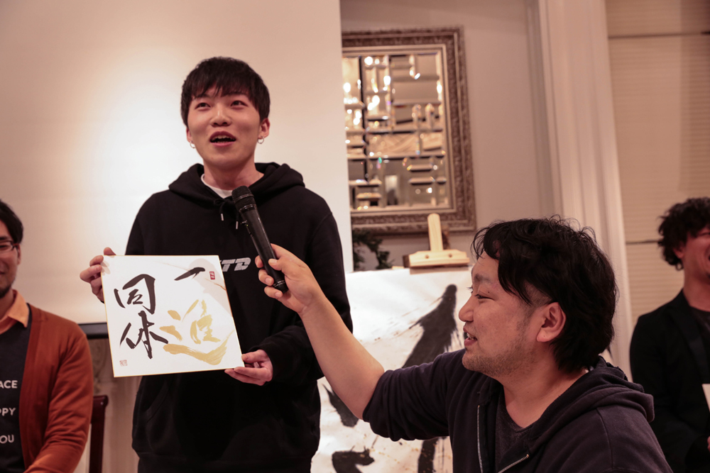 運営側であらかじめいくつかのチームに分け、チームごとに今年の抱負を考えていただき、その抱負を書道家の小川さんが色紙に書いてくださいました。