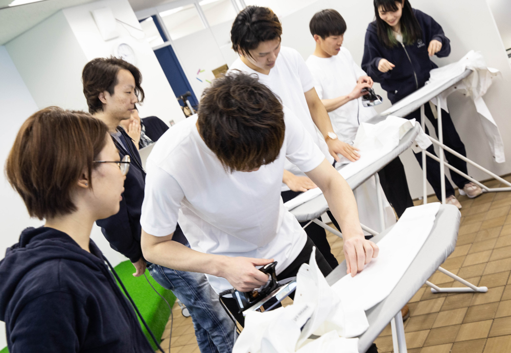 新入社員の3名は、先輩社員からの「襟は裏側からかけるんだよ」「袖は下側の線を揃えて、袖口から肩に向かって一気にアイロンかけるんだよ」といったアドバイスに耳を傾けながら、慣れない手つきながらも真剣にアイロンがけに取り組んでくれました。