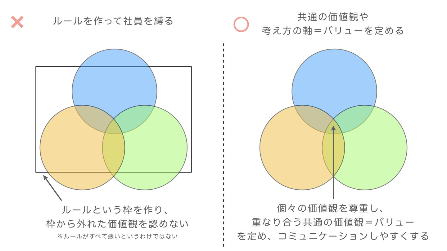 社員みんなの価値観同士が重なり合う部分、つまりは全員共通の価値観・考え方の軸/基準=バリューを定めることで、コミュニケーションしやすく、仕事を進めやすくしようと。
