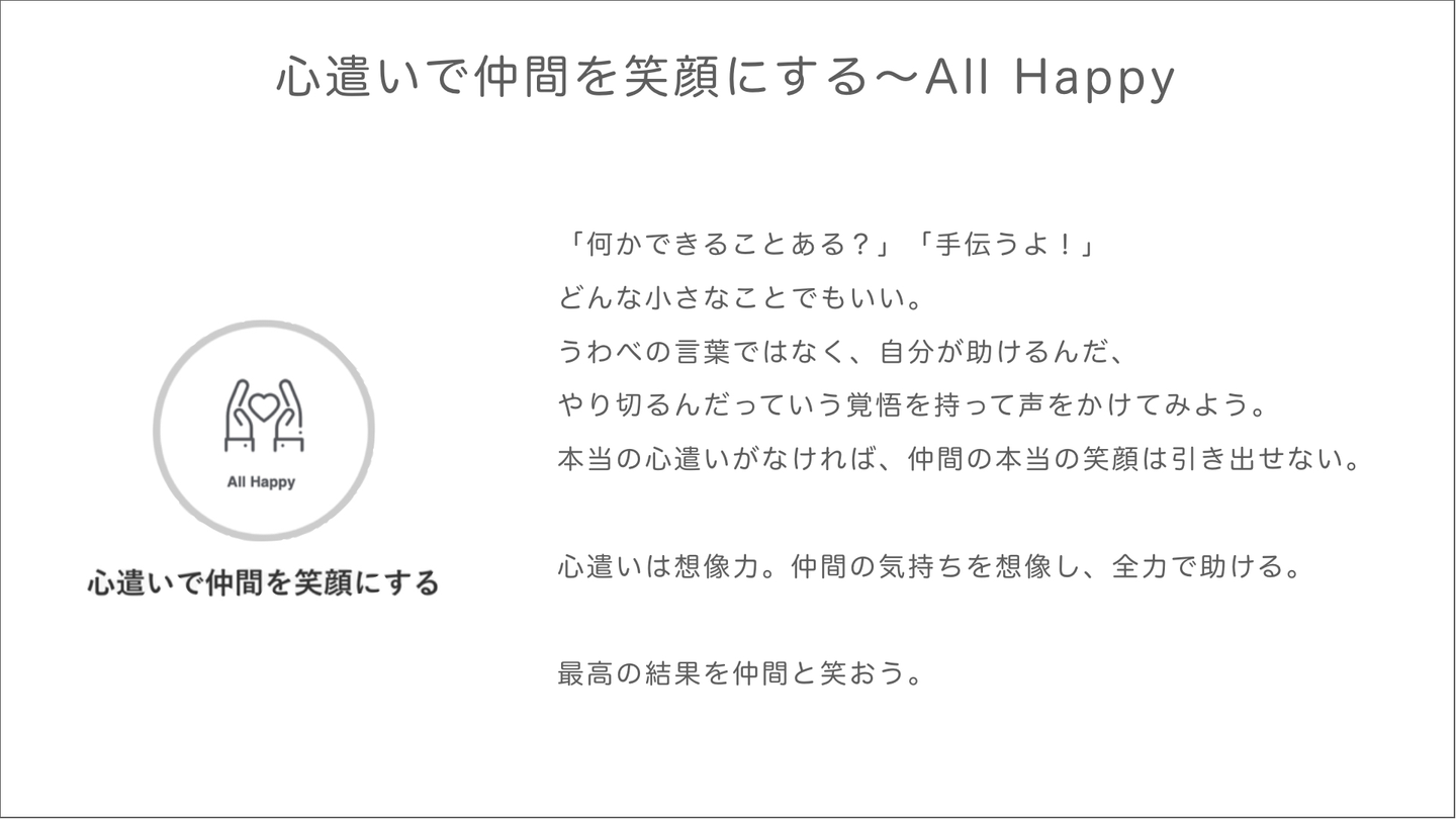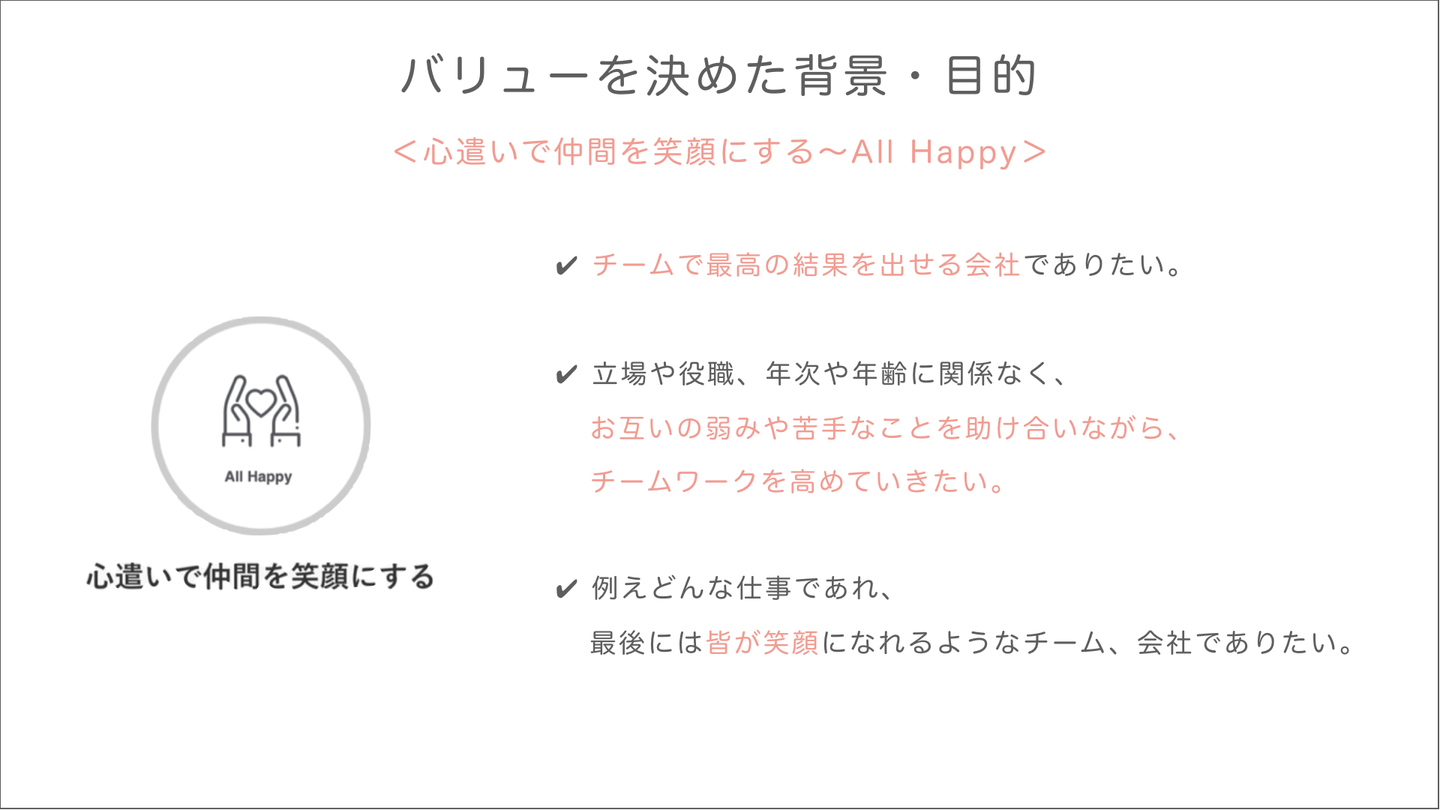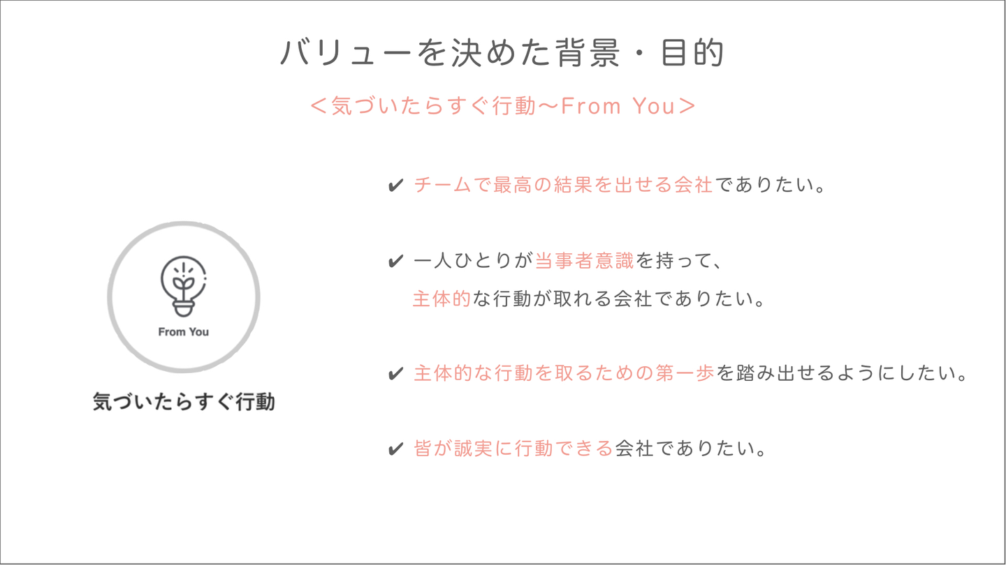 それでは、それぞれのバリュー、バリューを決めた背景・目的、具体的な行動基準・行動目標についてご紹介します。