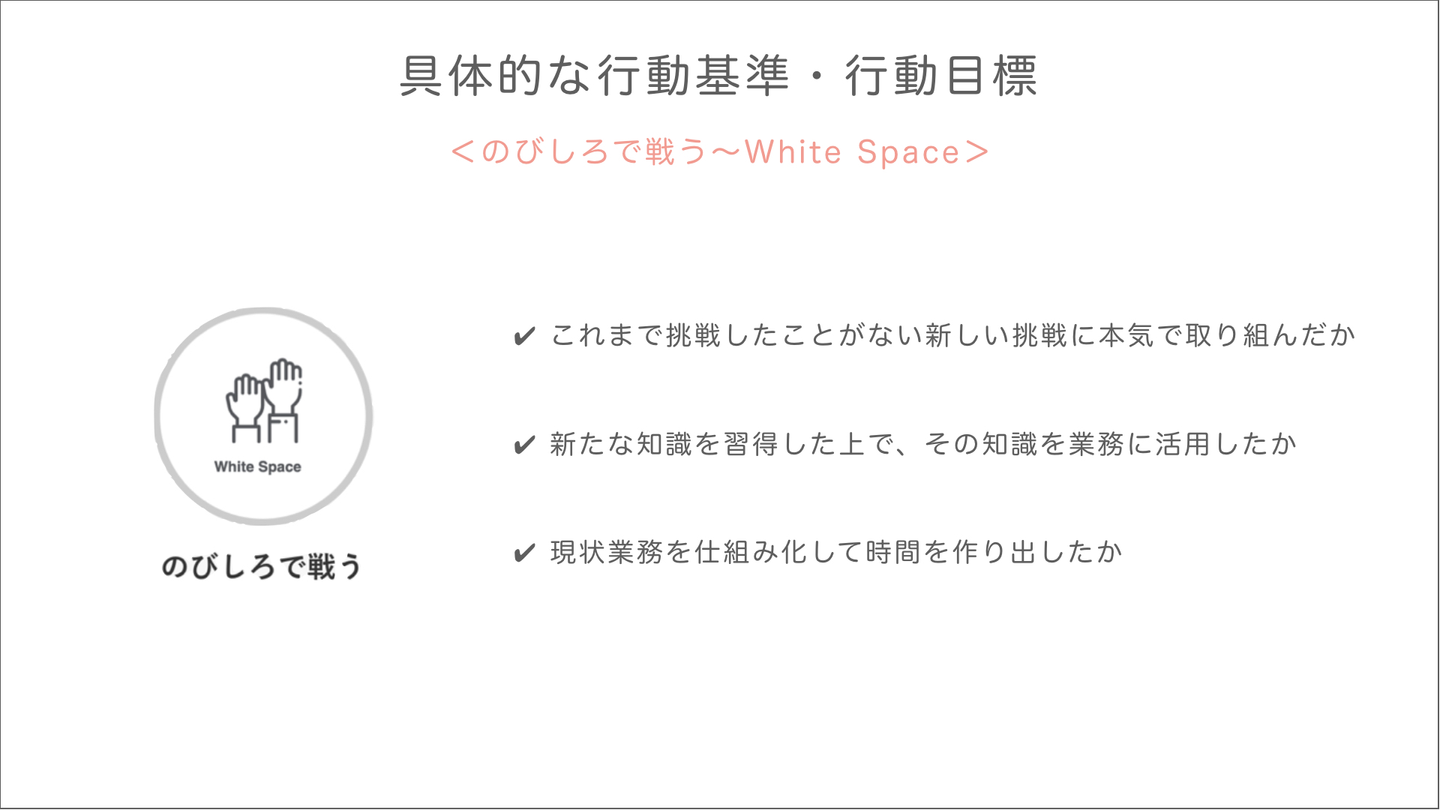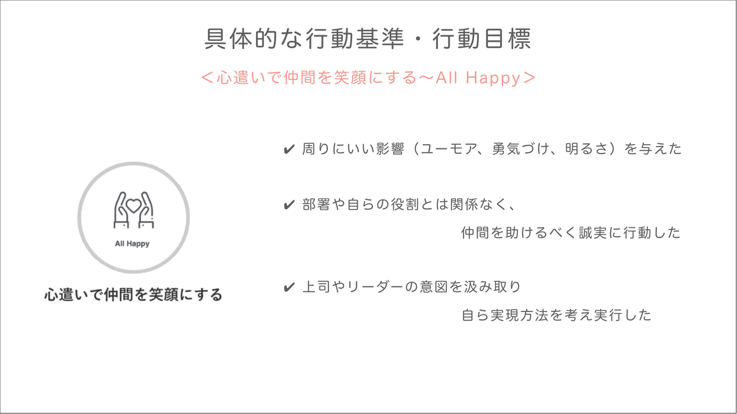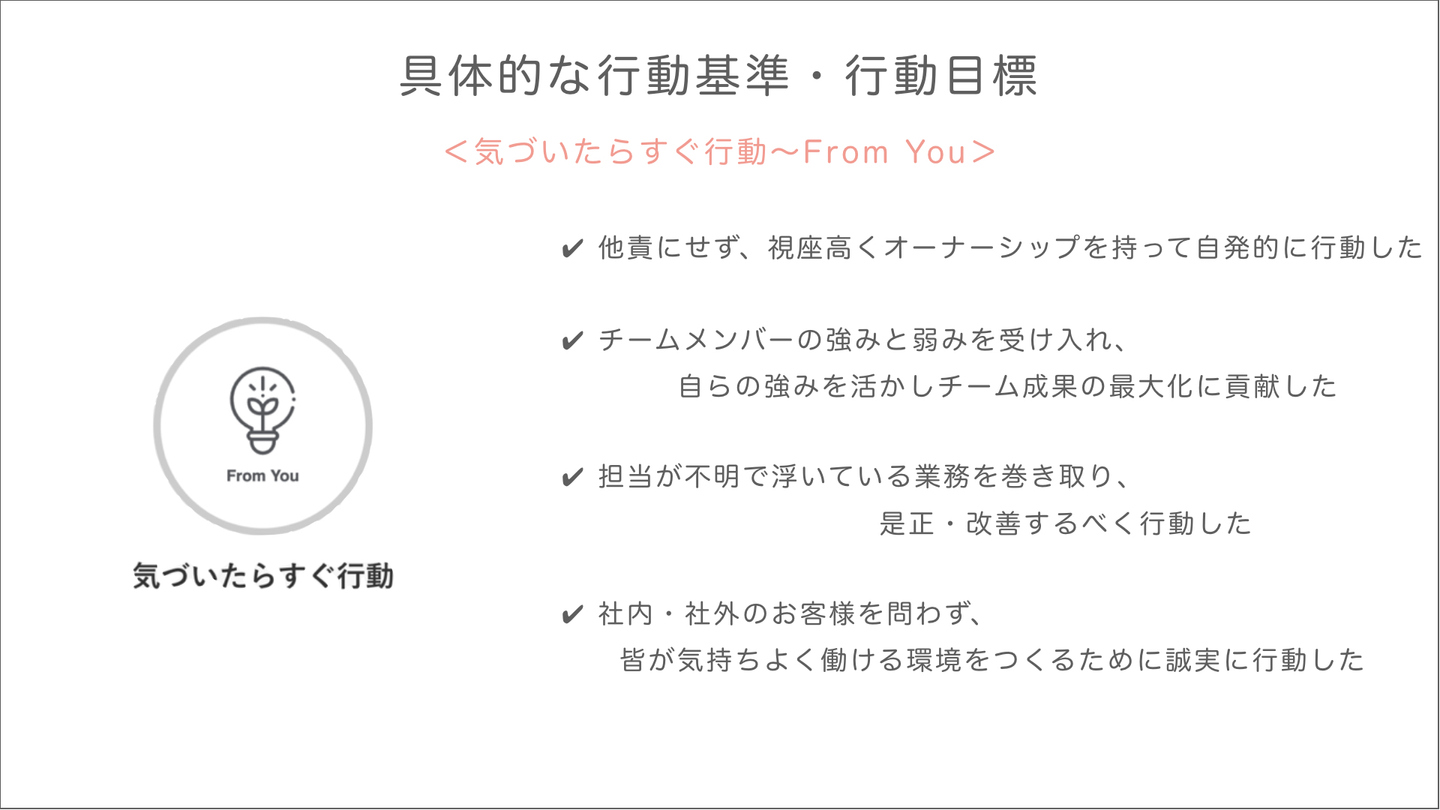 それでは、それぞれのバリュー、バリューを決めた背景・目的、具体的な行動基準・行動目標についてご紹介します。