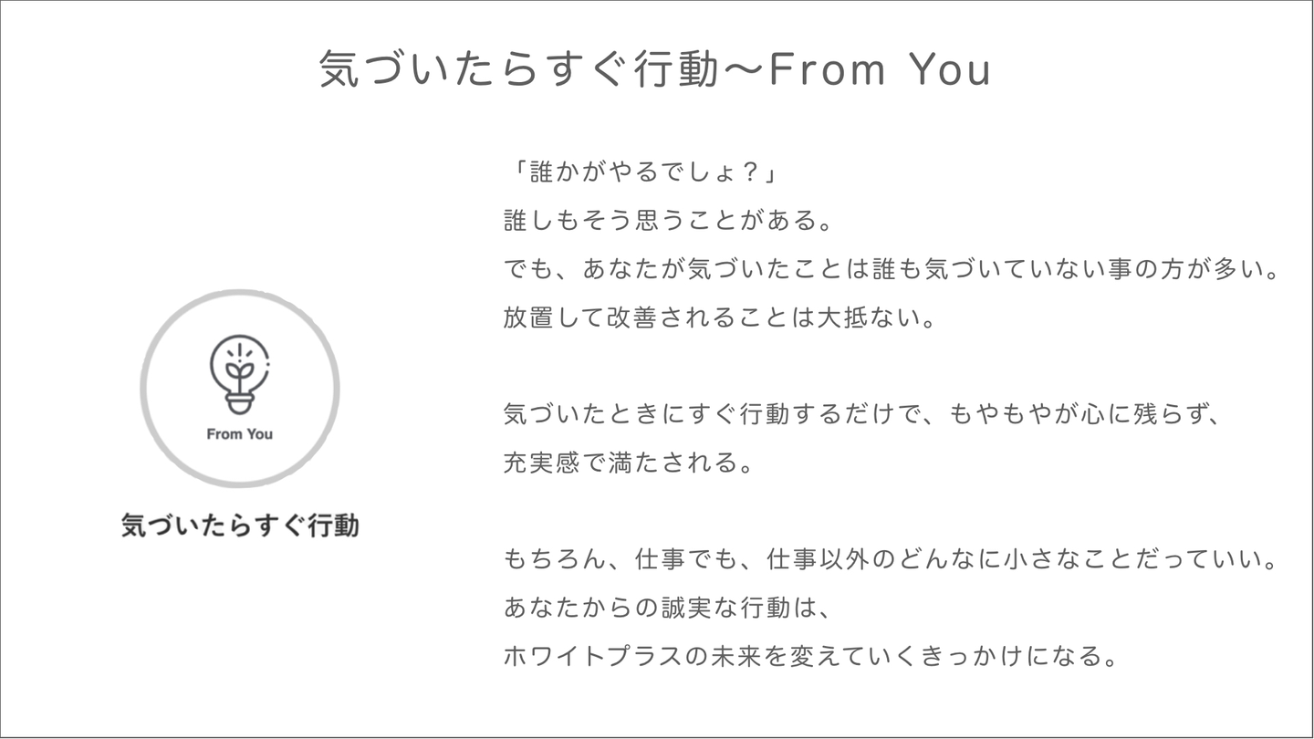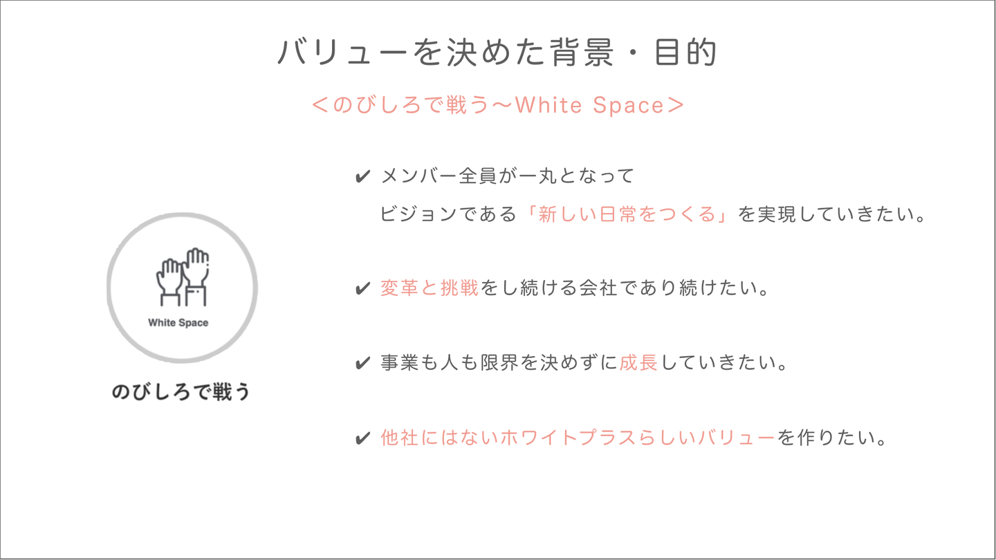 今回はホワイトプラスが大切にしているバリューについて、それぞれのバリューの説明はもちろんですが、作った背景や目的も含めて、ご紹介します。