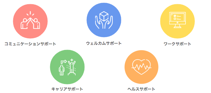 社員一人ひとりが自分らしく活躍できるように、主に下記5つの側面から社員をサポートしており、全体図はこのようになっています。