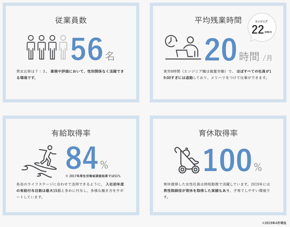 ちなみに、コーポレートサイトの採用ページには「データで見るホワイトプラス」として、下記のインフォグラフィックを掲載しています。