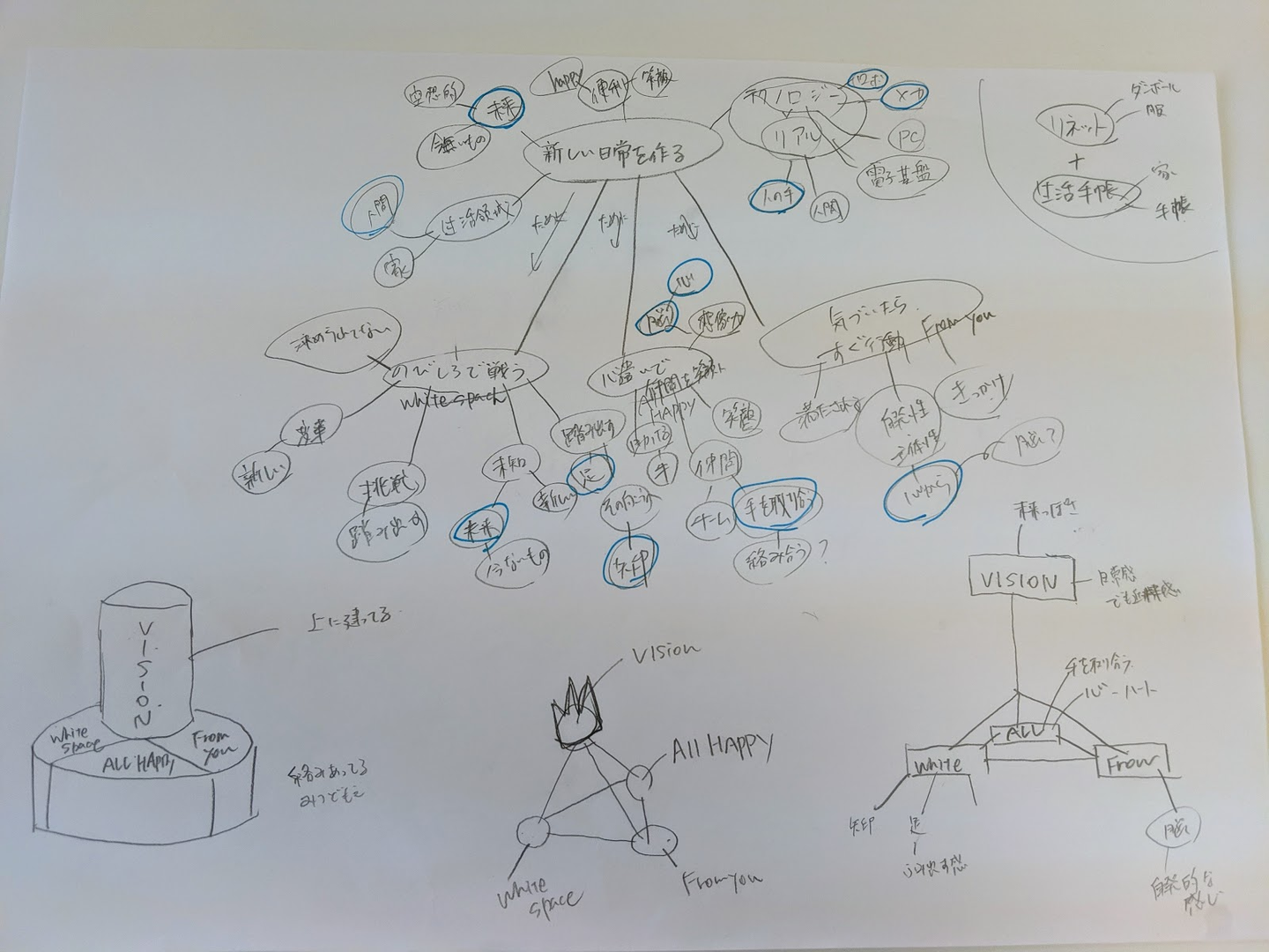 自分が今回のデザインを通して何を表現したいのかを考え直すため、連想ゲームのように思いついたことを紙に書き出してみます。