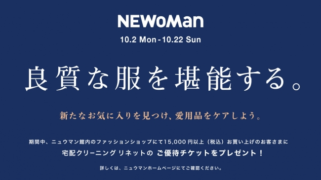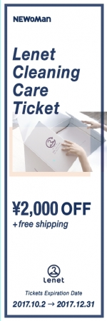 キャンペーン期間中に、NEWoMan新宿館内のファッションショップにて15,000円以上ご購入いただいたお 客さまへ、Lenetをご利用頂ける2,000円のクリーニングチケットをプレゼントいたします。