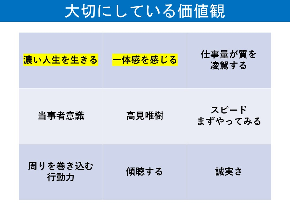 社会人になってから、追加されたこと(「スピード、まずやってみる)など)もありますが、概ねは新卒の就職活動をしていたときとあまり変わりません。