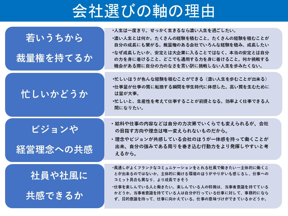 ・会社選びの軸は、価値観と結びついていれば何でもいい。理由が大事