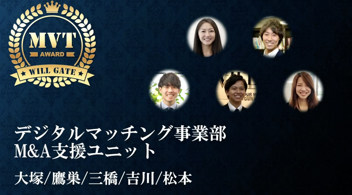 次に全社MVT(チーム賞)の発表です。全社MVTは、第3Qを通じてもっとも成果に貢献したチームに贈られる賞。今回は、M&A仲介支援事業「Willgate M&A」を手がける「M&A支援ユニット」が受賞しました。