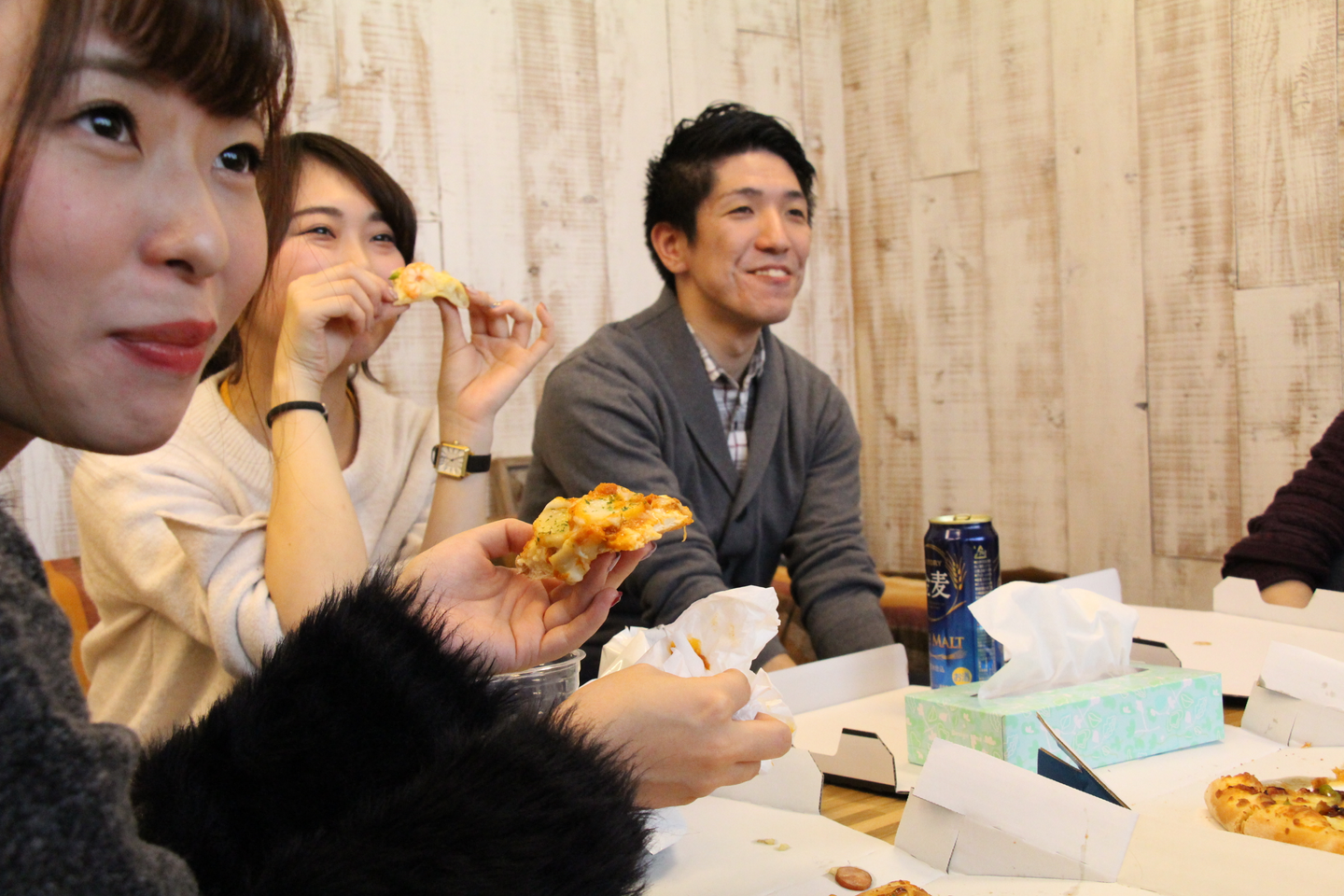 お昼にはピザを食べ、お酒を飲み、ときには作ったもので遊びながら…。