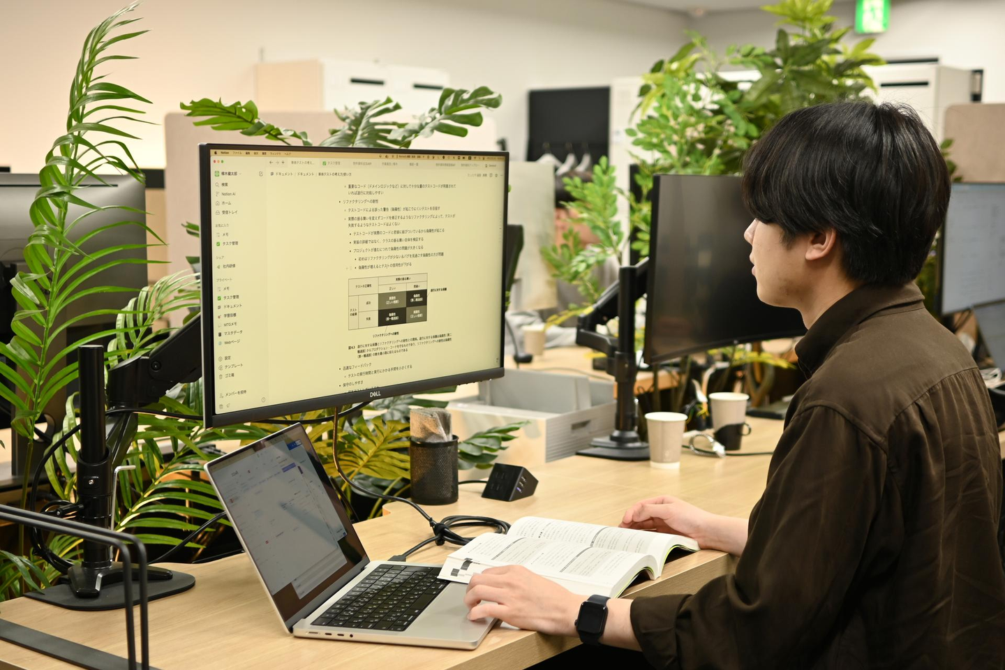 異業種からエンジニアに挑戦するのは、最初はハードルが高く感じるかもしれません。実際、入社当初は分からないことも多く戸惑うこともありましたが、入社後はメンターや上司の方が親身にサポートしてくださり、動画教材や書籍といった学習環境も整っているため、まず自分で調べ、先輩に聞きにいく姿勢さえあれば着実に成長できる環境です。