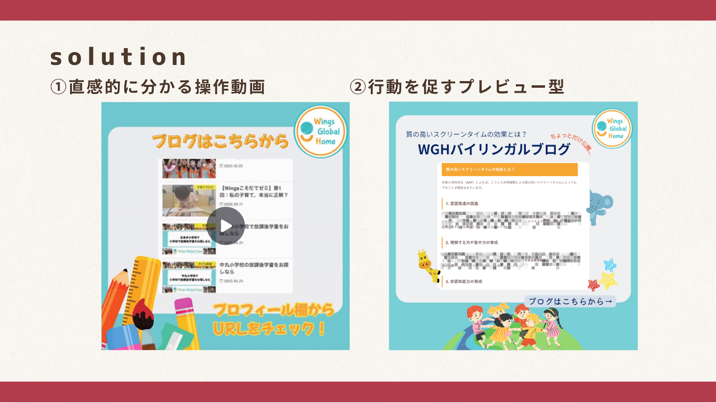 もう一つは、投稿が英語教育の情報発信にとどまっていたことです。興味は引けていても、見た人が見学という行動に進むための後押しができていませんでした。