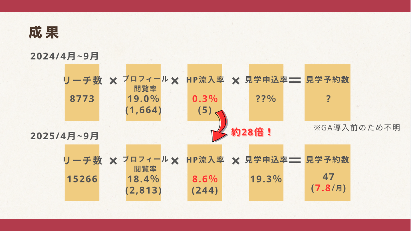 投稿を作ること自体がゴールではなく、「見学予約」という最終的な目的につながって初めて意味を持つ。その視点を持つことで、課題を正しく捉え、改善することができました。