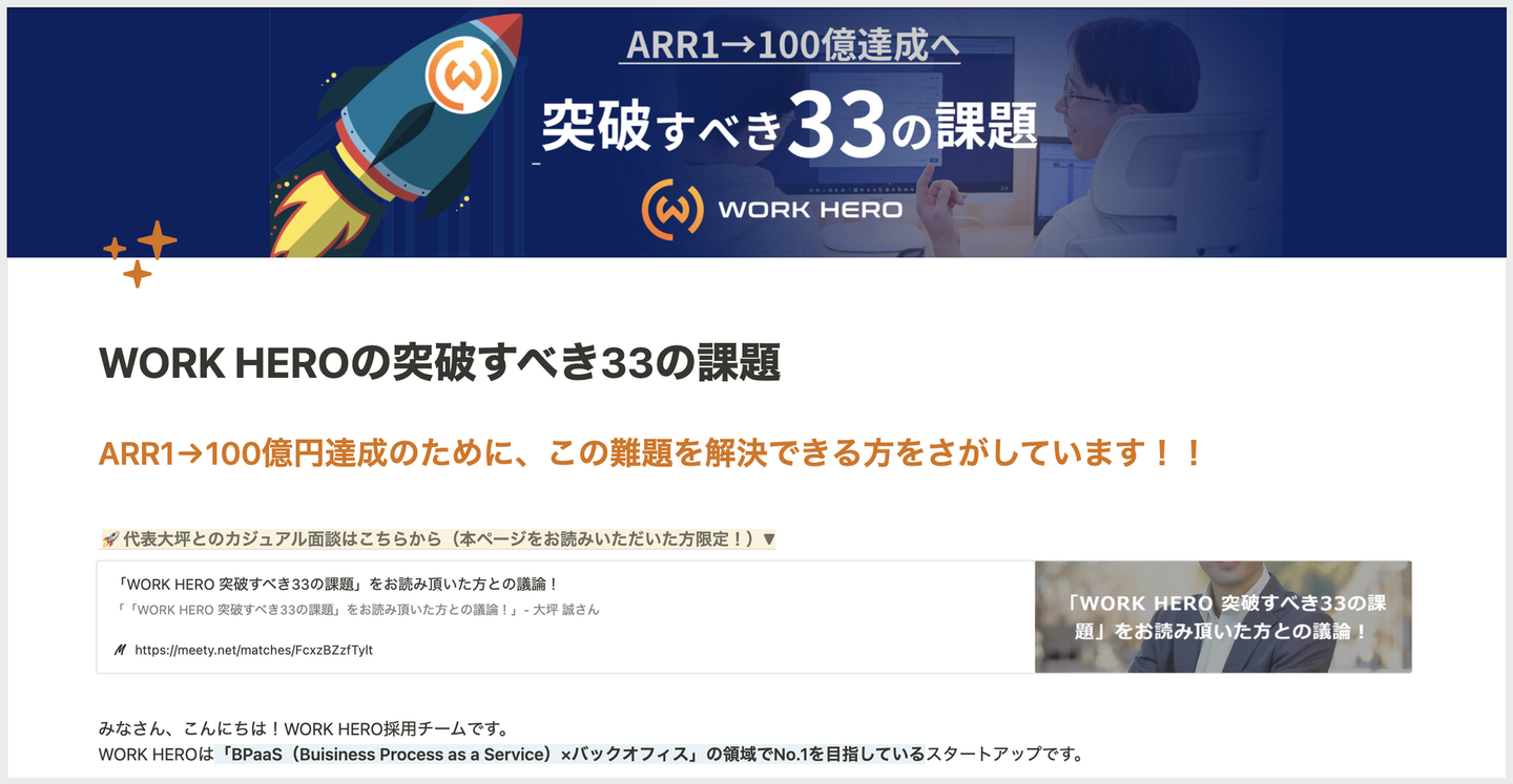 🚀 代表大坪とのカジュアル面談はこちらから(本ページをお読みいただいた方限定!)▼ 「WORK HERO 突破すべき33の課題」をお読み頂いた方との議論! みなさん、こんにちは!WORK HERO採用チームです。 WORK HEROは**「BPaaS(Buisiness Process as a Service)×バックオフィス」の領域でNo.1を目指している**スタートアップです。 2022年春にシードラウンド1.4億円の資金調達のプレスリリースを行い、2023年近々中にARR1億円到達予定です。 拡大