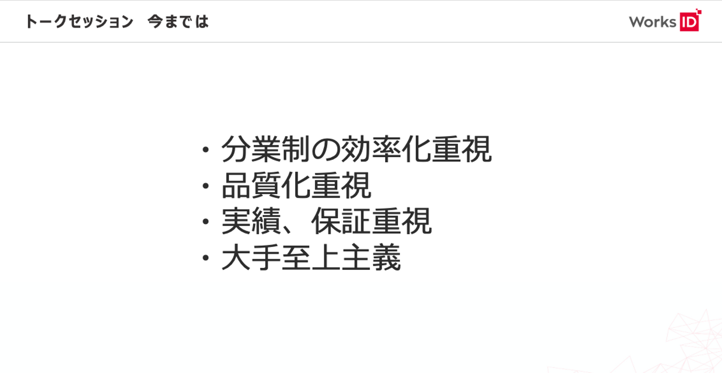 それから、皆さんもご存知かと思いますが、大手至上主義です。日本のIT業界はよくゼネコンと言われていて、大手企業が元請けでその下に二次、三次の下請けがいるという構造になっています。これは、何か問題が起きたときに、損害賠償を払える体力や保証力、信用力があるかというところで「実績・保証重視」になると、やはり大手企業が一番になってしまうからです。