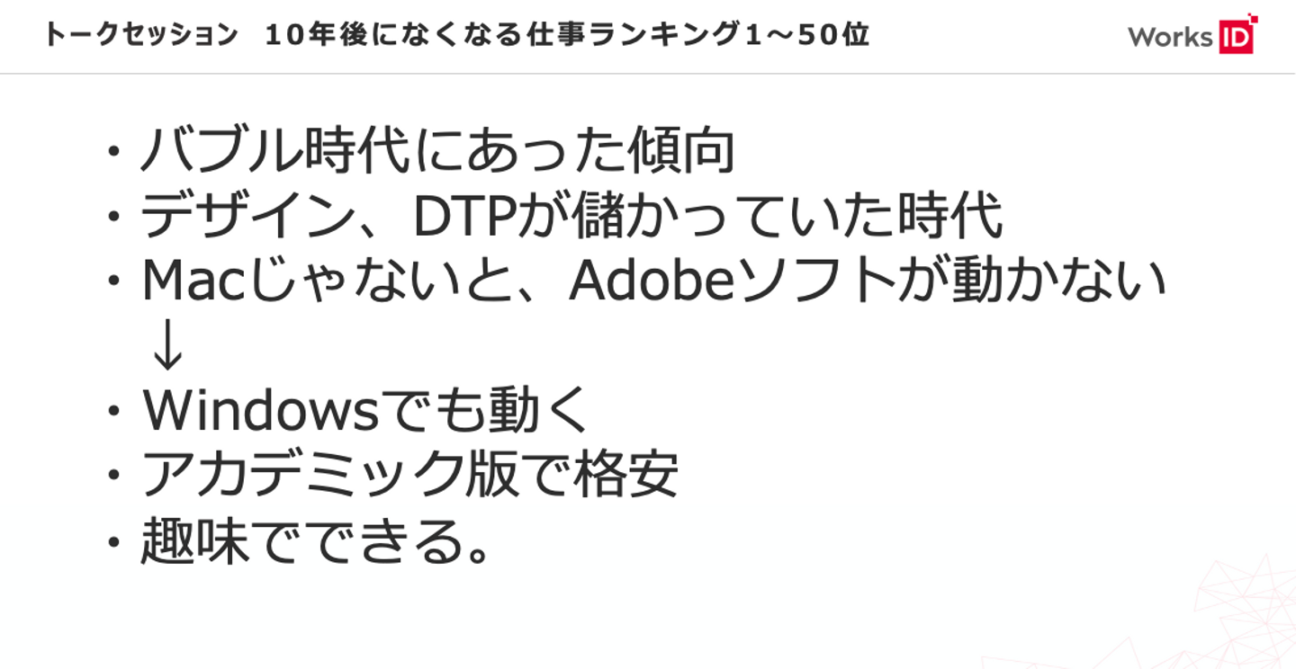 これと同じようなことが起こったのがバブル時代です。当時は、AdobeのIllustratorやPhotoshopを使ったデザイン制作やDTPの仕事がものすごく儲かっていました。これは、Adobeソフトを動かせるパソコンが超高額のMacintoshのみで、かつソフト自体も高額だったため、その両方を所有できる資金力のある企業しか作れないという制約があったからです。