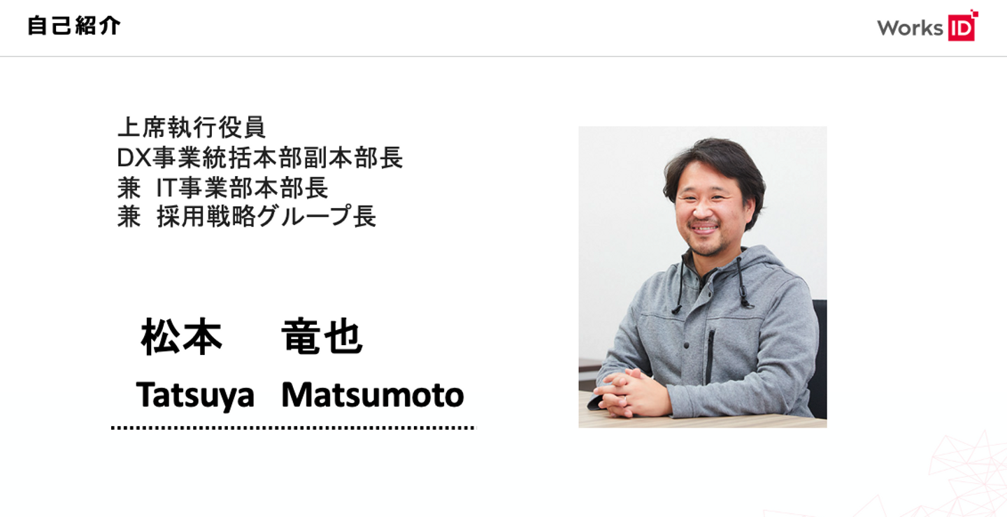 ワークスアイディ株式会社 上席執行役員 DX事業統括本部副本部長 兼 IT事業本部長 兼 採用戦略グループ長を務める。経歴としては、文系大学からエンジニアとしてIT企業へ入社。複数のプロジェクトへの参画や支社立ち上げを行い、その後起業へ。設立1年目から黒字を出し20名規模まで拡大させる。2010年ワークスアイディ株式会社にM&Aを実施。M&A後は会社が部の形なり、仕切り直し9人でのスタート。順調に成長し2021年4月時点(新卒含む)で200名以上の規模の部署へ。