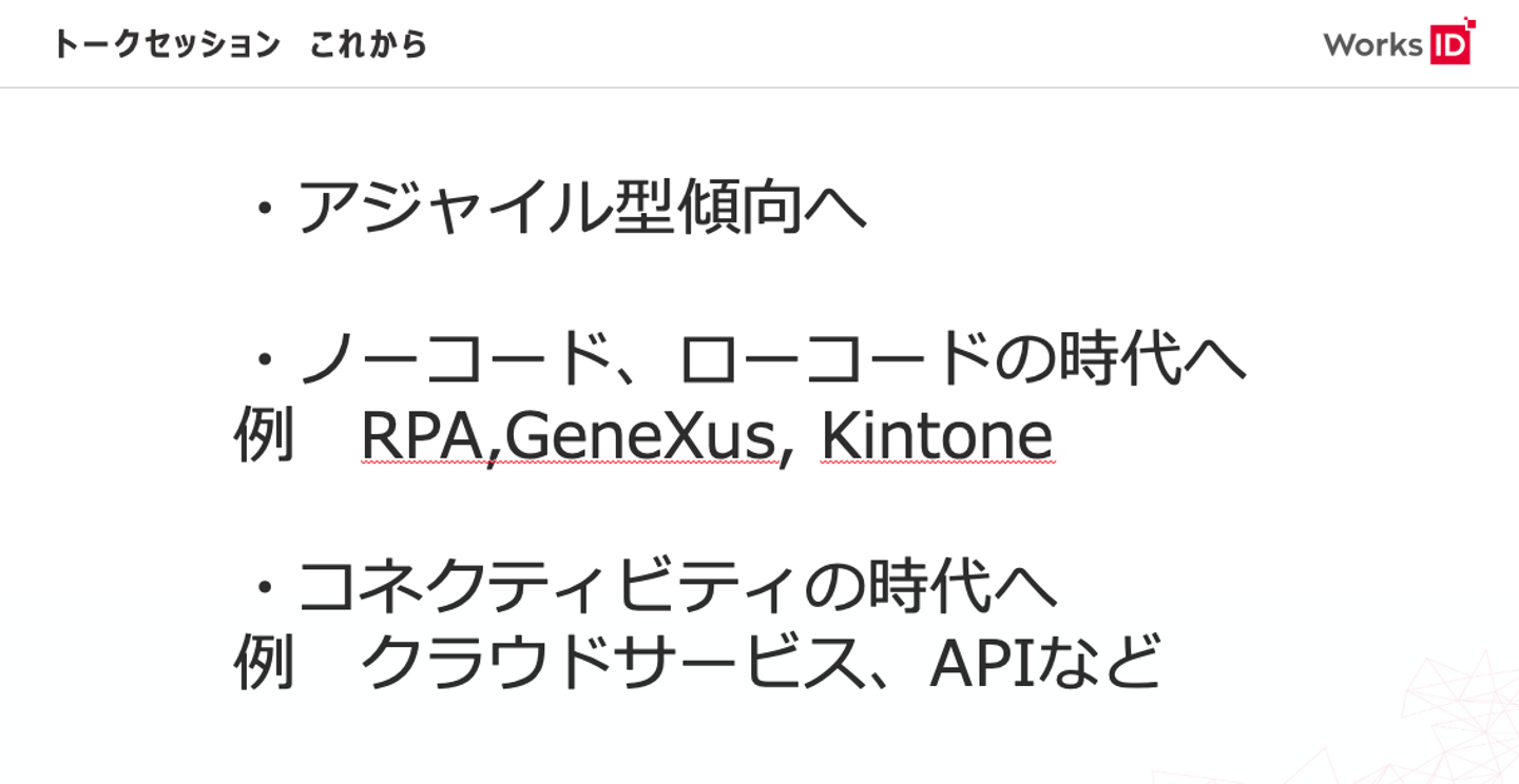 また、「GeneXus」という、DBのER設計や基本設計をオートジェネレートコードで作成できるプログラムも出てきましたし、サイボウズ社が提供している「kintone」も、RPAやGeneXusよりも手軽に、ノーコードでシステムを作ることができるツールとして市場に出てきました。