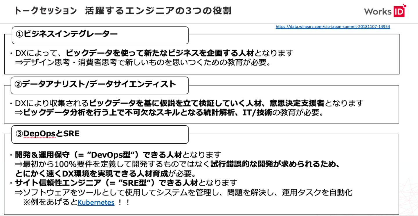 3つ目は、「DevOps(開発・運用保守)」と「SRE(サイト信頼性エンジニア)」です。これまではプログラマー、システムエンジニアという職種でしたが、これが「DevOpsエンジニア」や「SREエンジニア」という名前になります。サービスの開発スピードを上げて市場への投入時期を早めようという動きが強まっているため、Development Operationsという形で、開発と運用保守を一緒に進めるDevOpsエンジニアという職種に変わってきています。