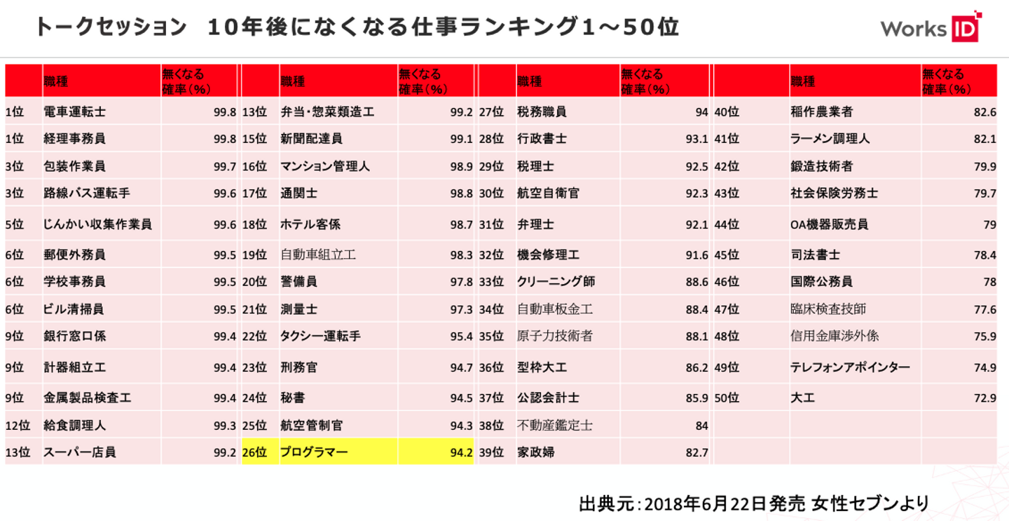 2018年6月22日に発売された週刊誌の中で「10年後になくなる仕事ランキング」が発表されたのですが、その中でプログラマーはなくなる確率が94%ということで、なんと26位に挙げられています。
