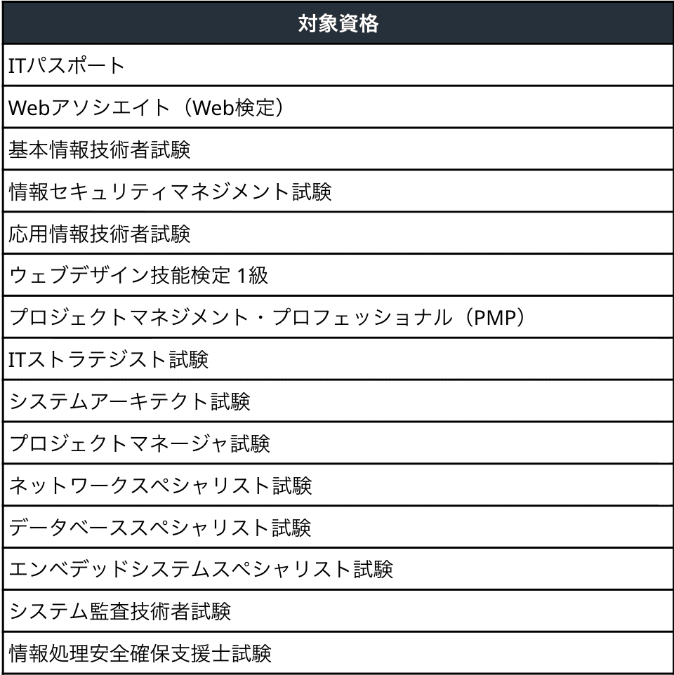 「基本情報技術者試験」や「プロジェクトマネージャ試験」などの情報技術系の資格から、「簿記」や「ビジネス実務法務検定」などの経営管理系の資格まで、幅広い資格試験が対象となっています。