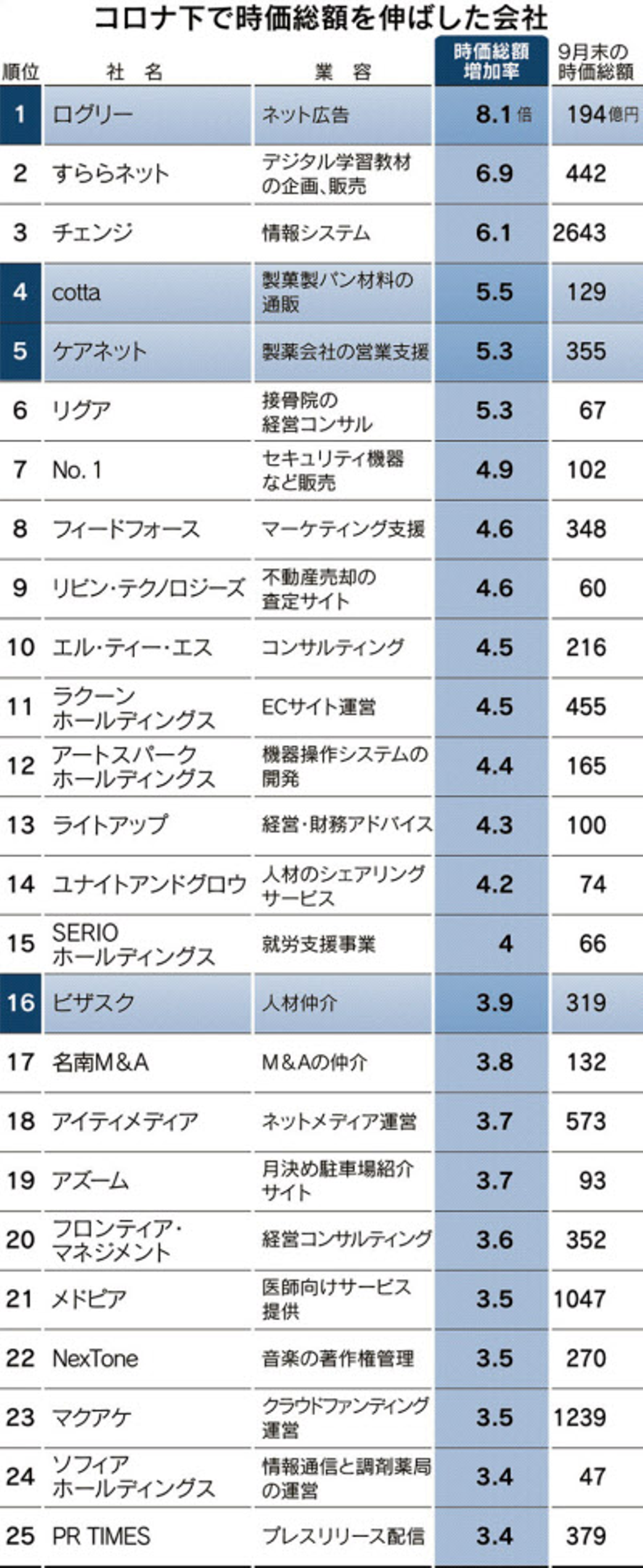 「コロナ下で時価総額が伸びた中堅企業 1位はログリー」(日経新聞、2020年10月20日)