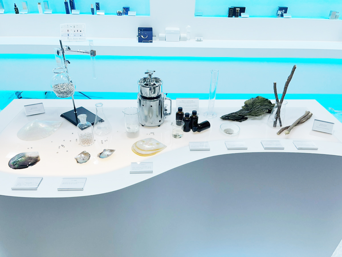 フラスコをはじめとした実験用具と、madama・hadaに配合されている海由来の成分のもととなる真珠貝、ネイチャーパール(ジュエリーの基準に満たない真珠)、ヒロメ等でセットを組み「海由来の成分を含む基礎化粧品」であることをアピールしています。