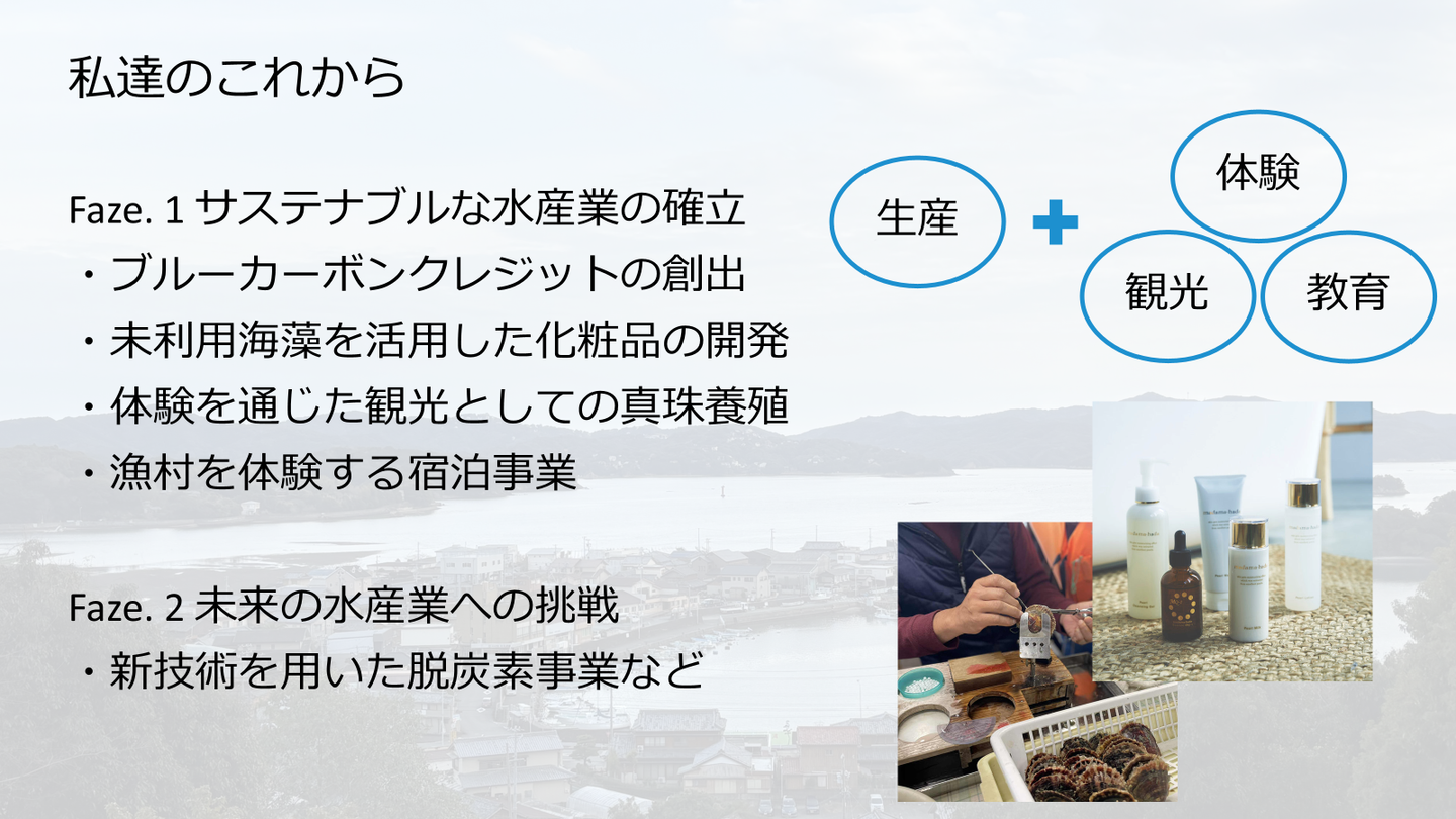 海の環境変化による藻場の減少、そして真珠養殖の場において貝の死亡率が上がり、真珠の品質が下がりつつある「海の課題」。それらに対して、未来の水産業を作るサステナブルラボはどうアプローチしてくのかのアイデアを発信いたしました。