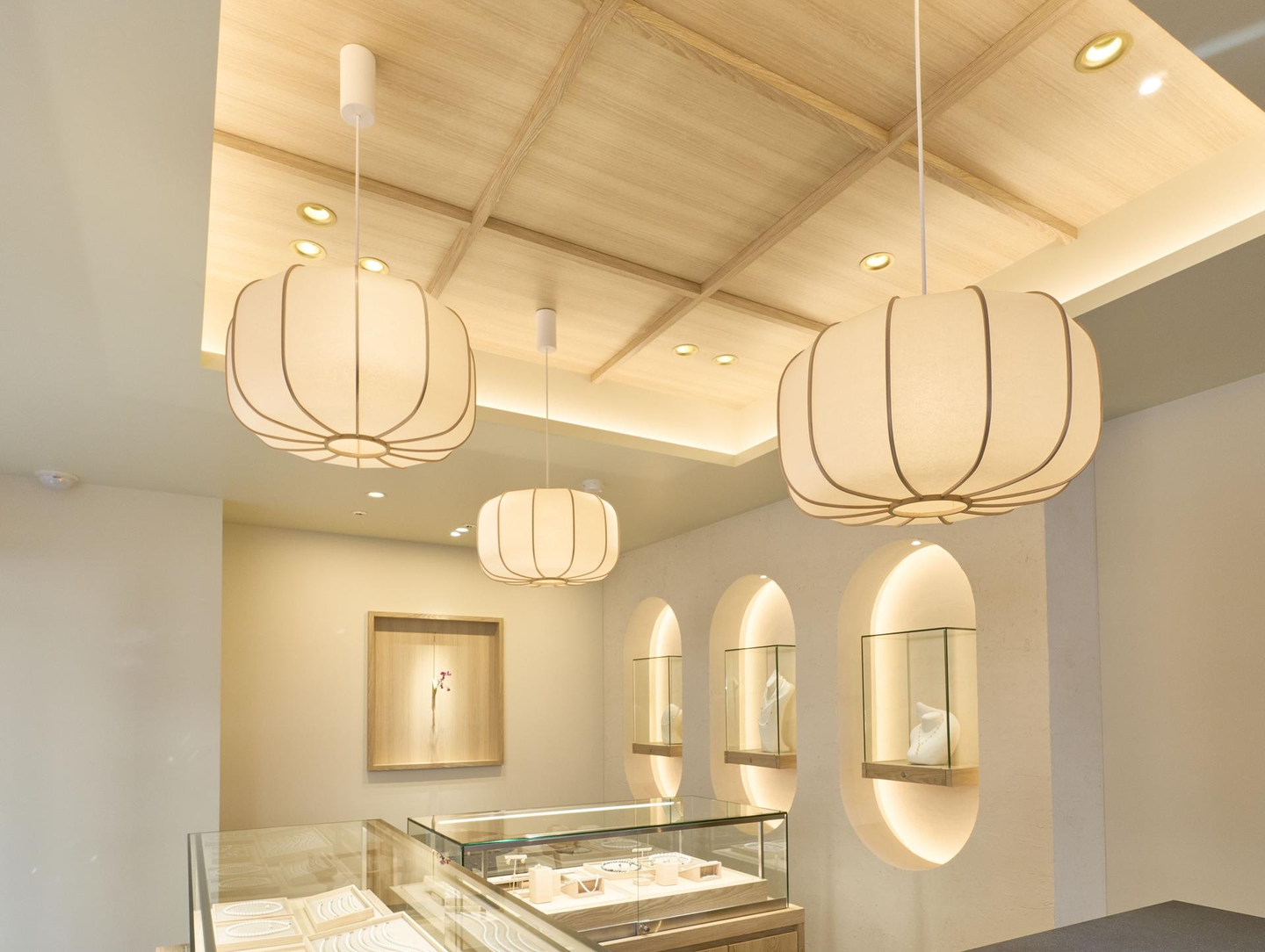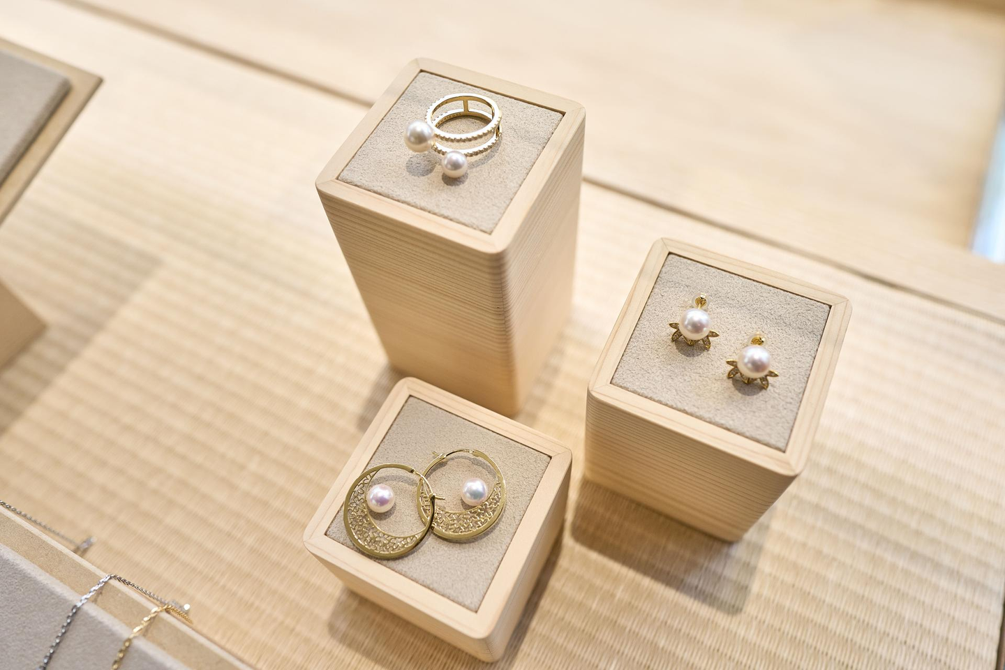 アコヤ真珠の繊細な美しさにマッチするように、店舗内には和の要素と日本の職人技が散りばめられています。
