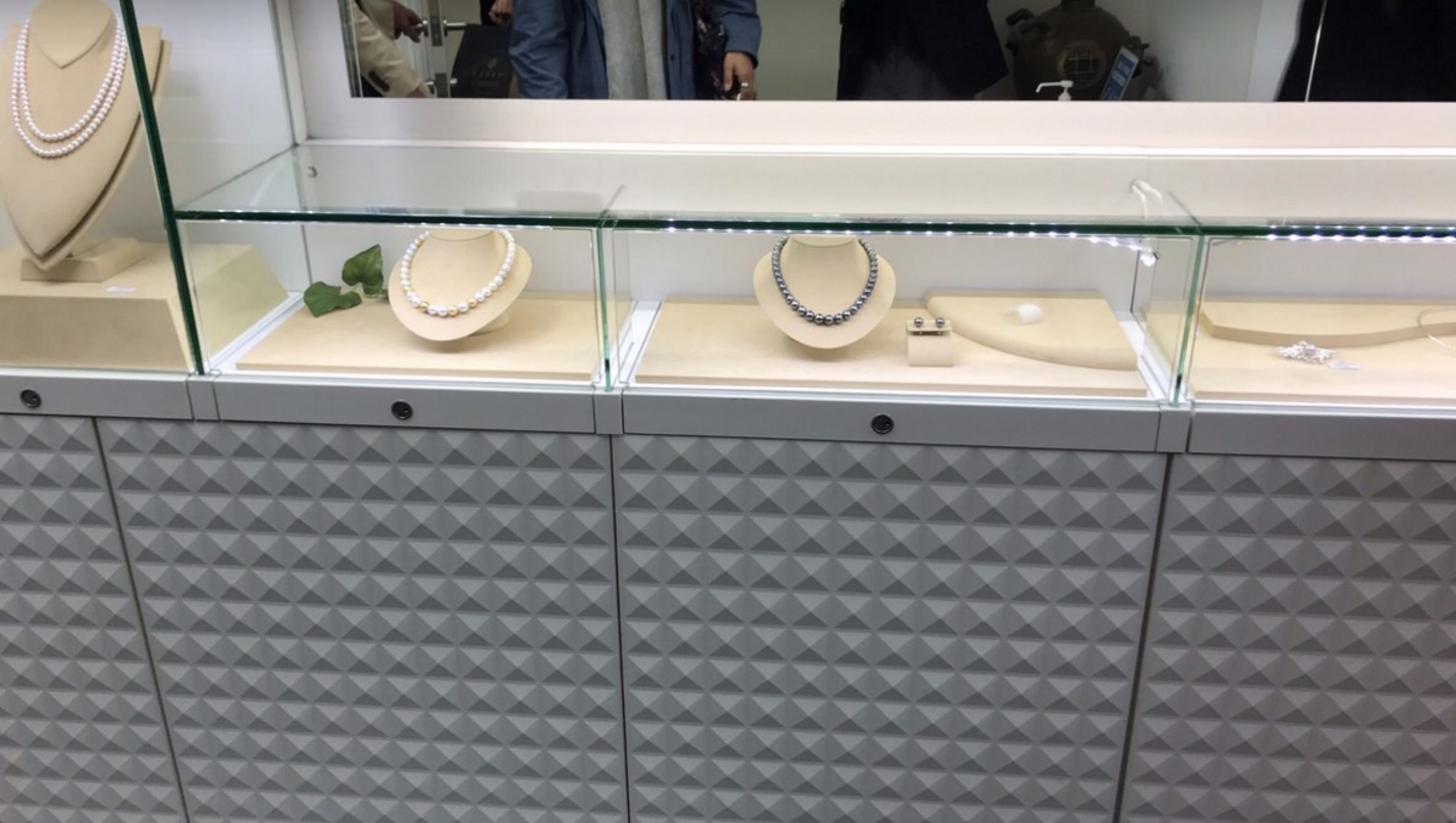 入り口には、美しい真珠のジュエリーがずらりと並んでいました。さすがWSP発祥の地!