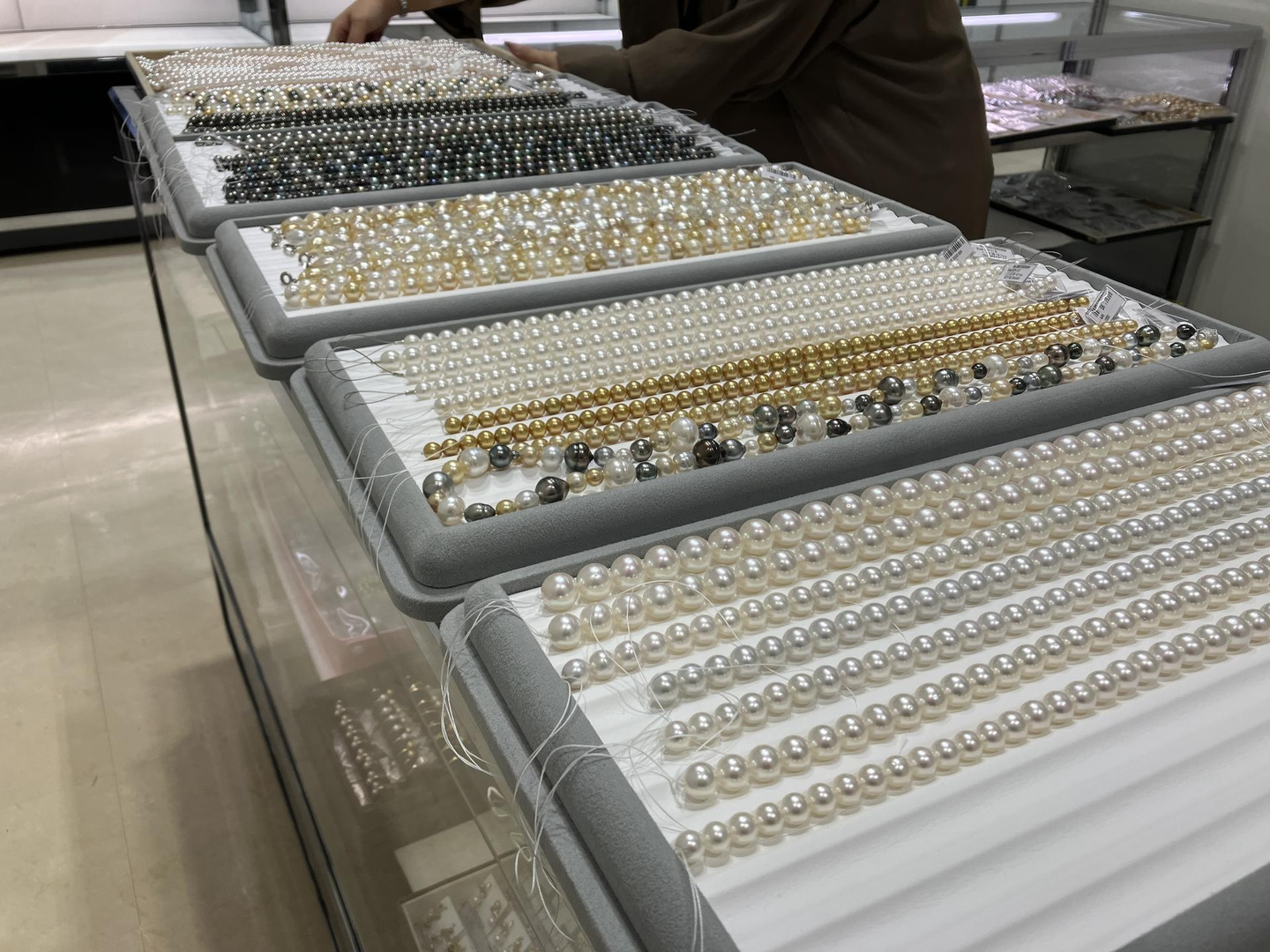 会場に着くと早速、自社ブースで今回出展する商品を並べていきます。並んでいるのを見ると簡単そうに見えるのですが、実はとても難しいです。真珠の種類やサイズはもちろんなのですが、鑑別書と呼ばれるグレード高低でも分けていきます。卸のメンバーはどんどん並べていきますが、真珠をあまり見ていない私は違いを言われてもわからないものもちらほら。もっと勉強が必要です、、、